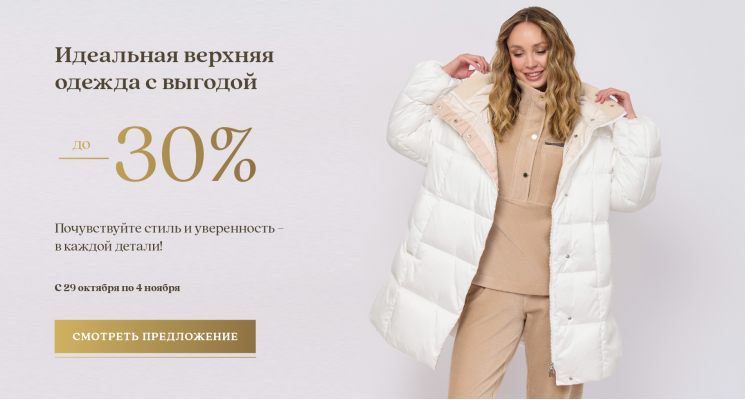 С 29 октября по 4 ноября объявляем скидку до 30% на избранный ассортимент верхней одежды.