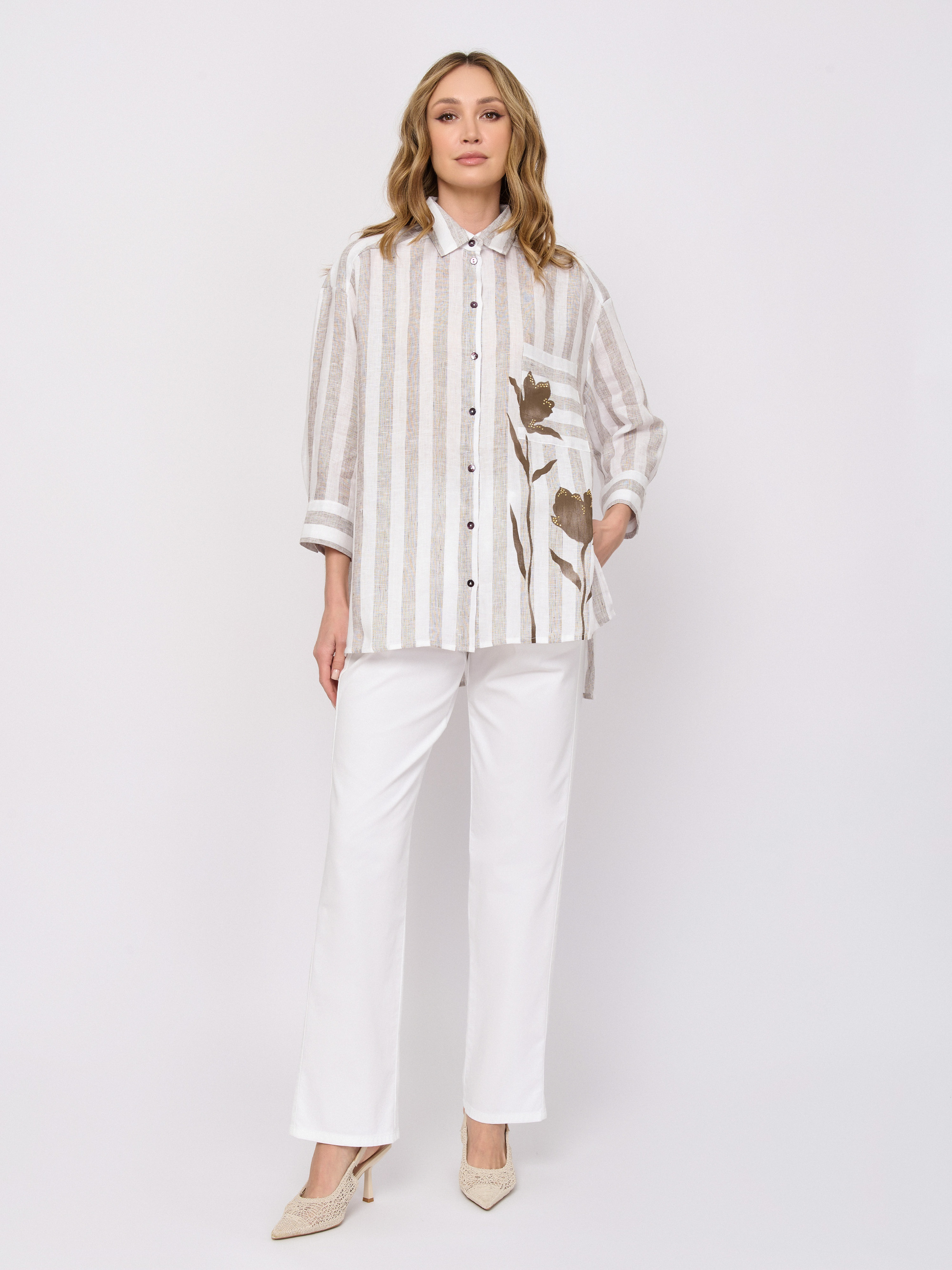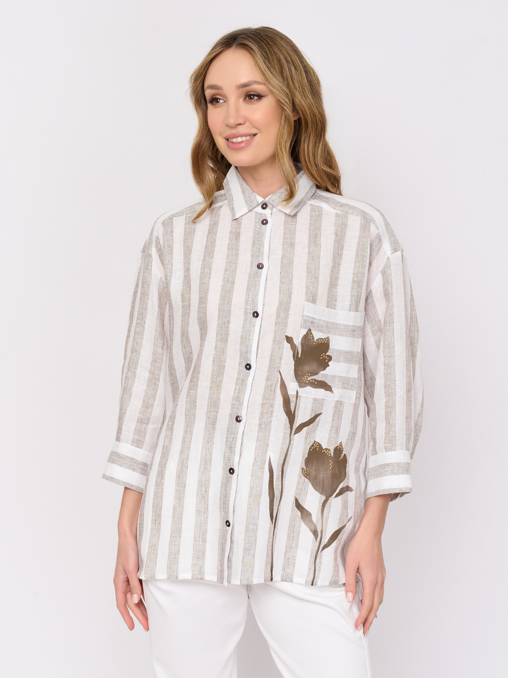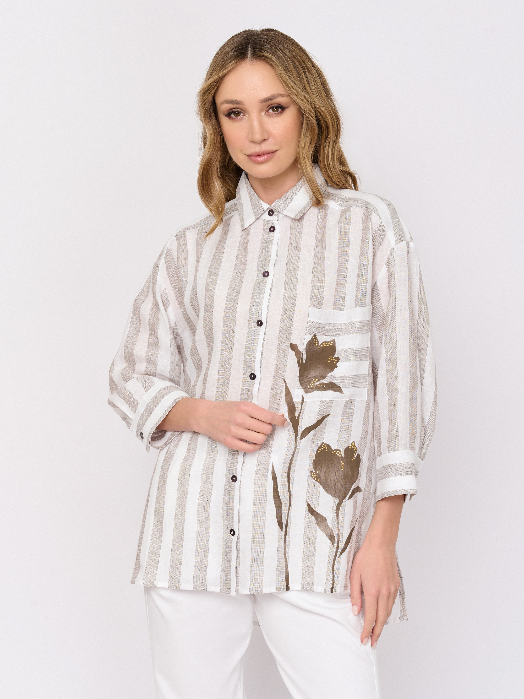 Детали: застежка пуговицы, рукава длинные, покрой асимметричный низ, рисунок полоска, цветы, карманы накладные, стразы.