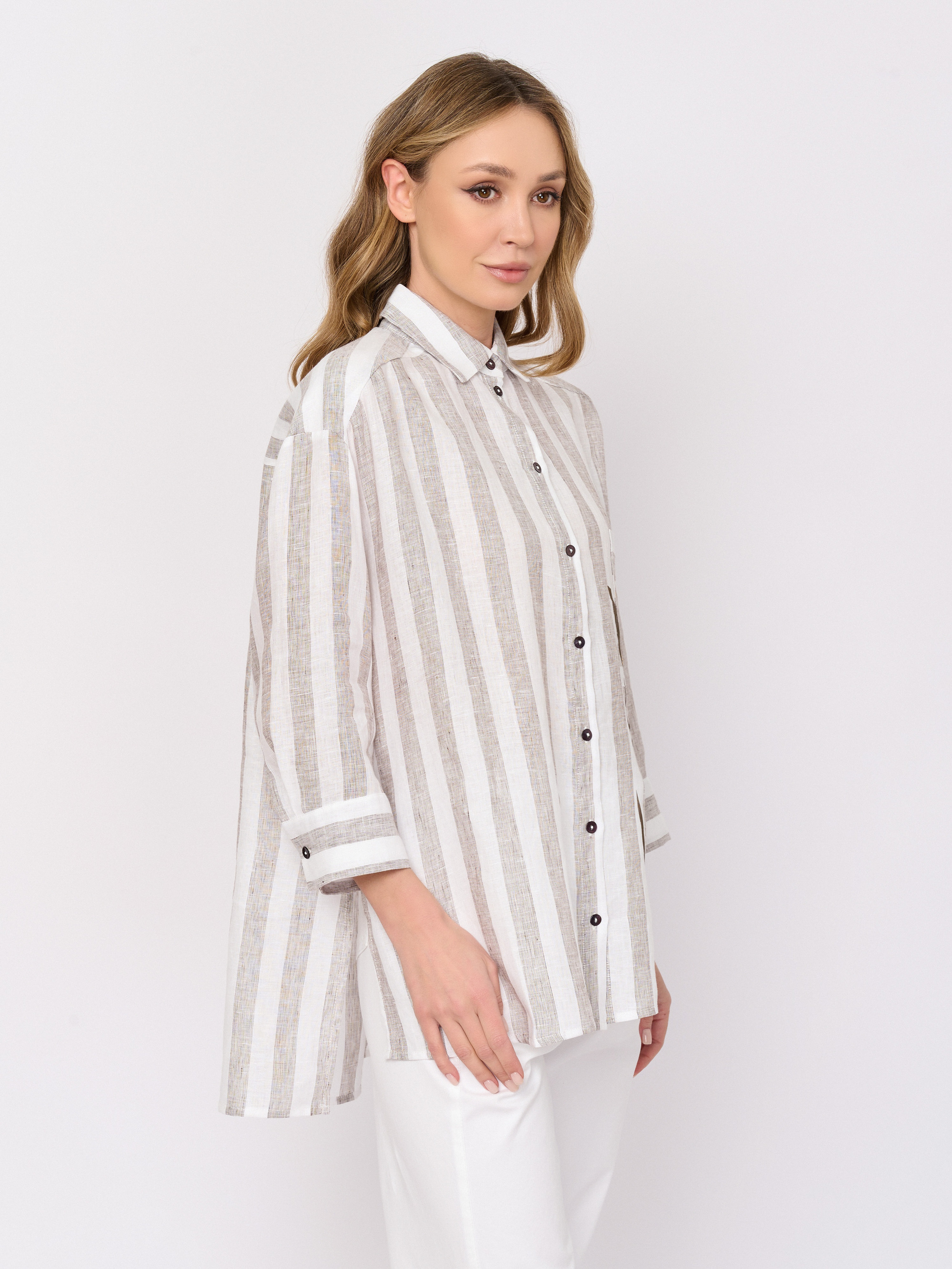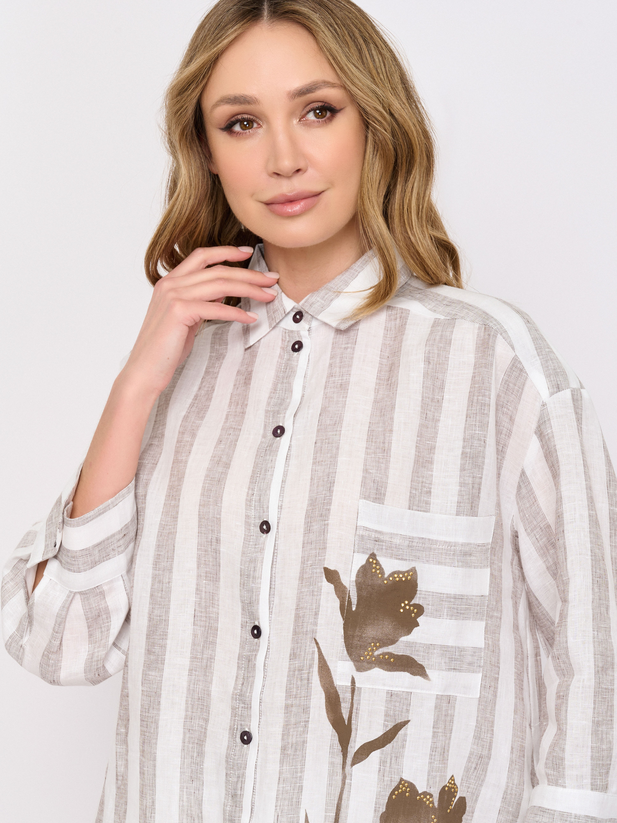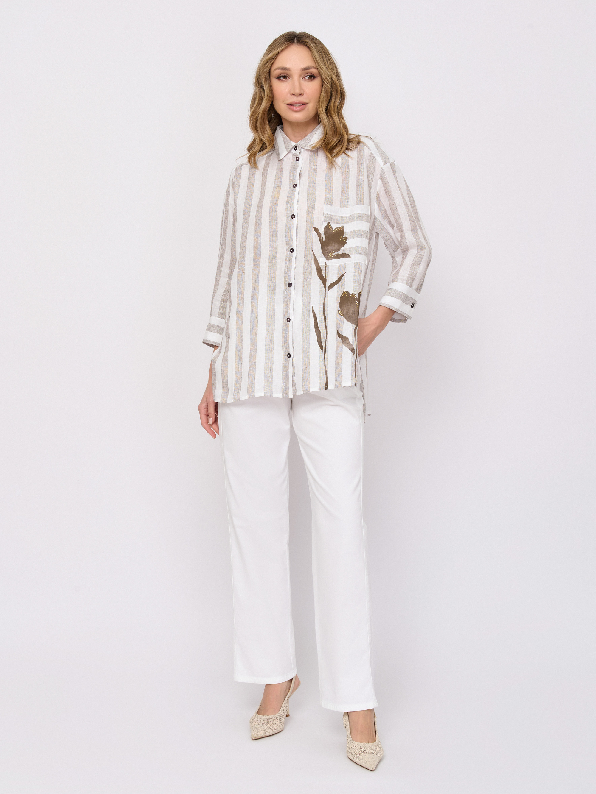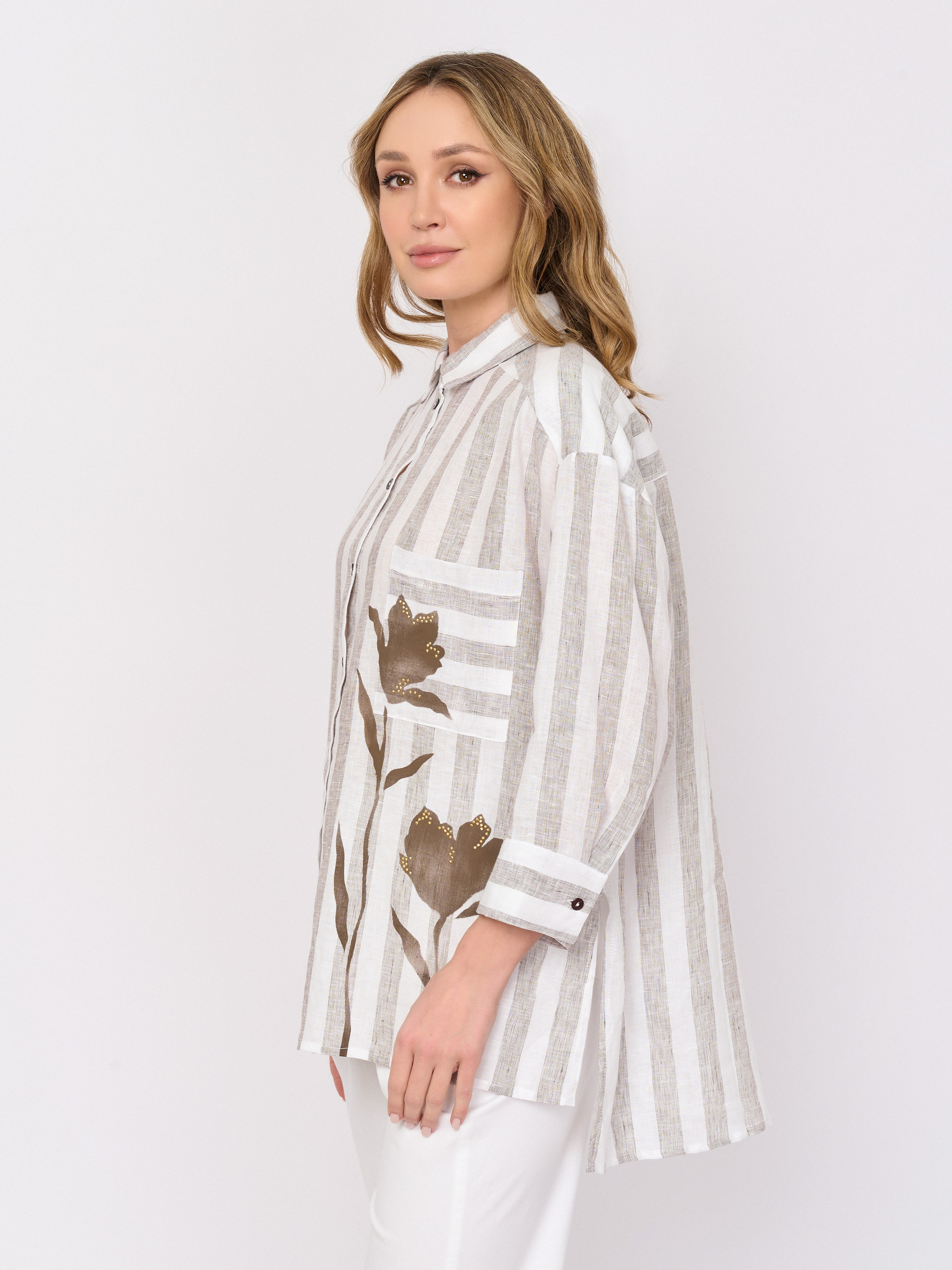 Детали: застежка пуговицы, рукава длинные, покрой асимметричный низ, рисунок полоска, цветы, карманы накладные, стразы.