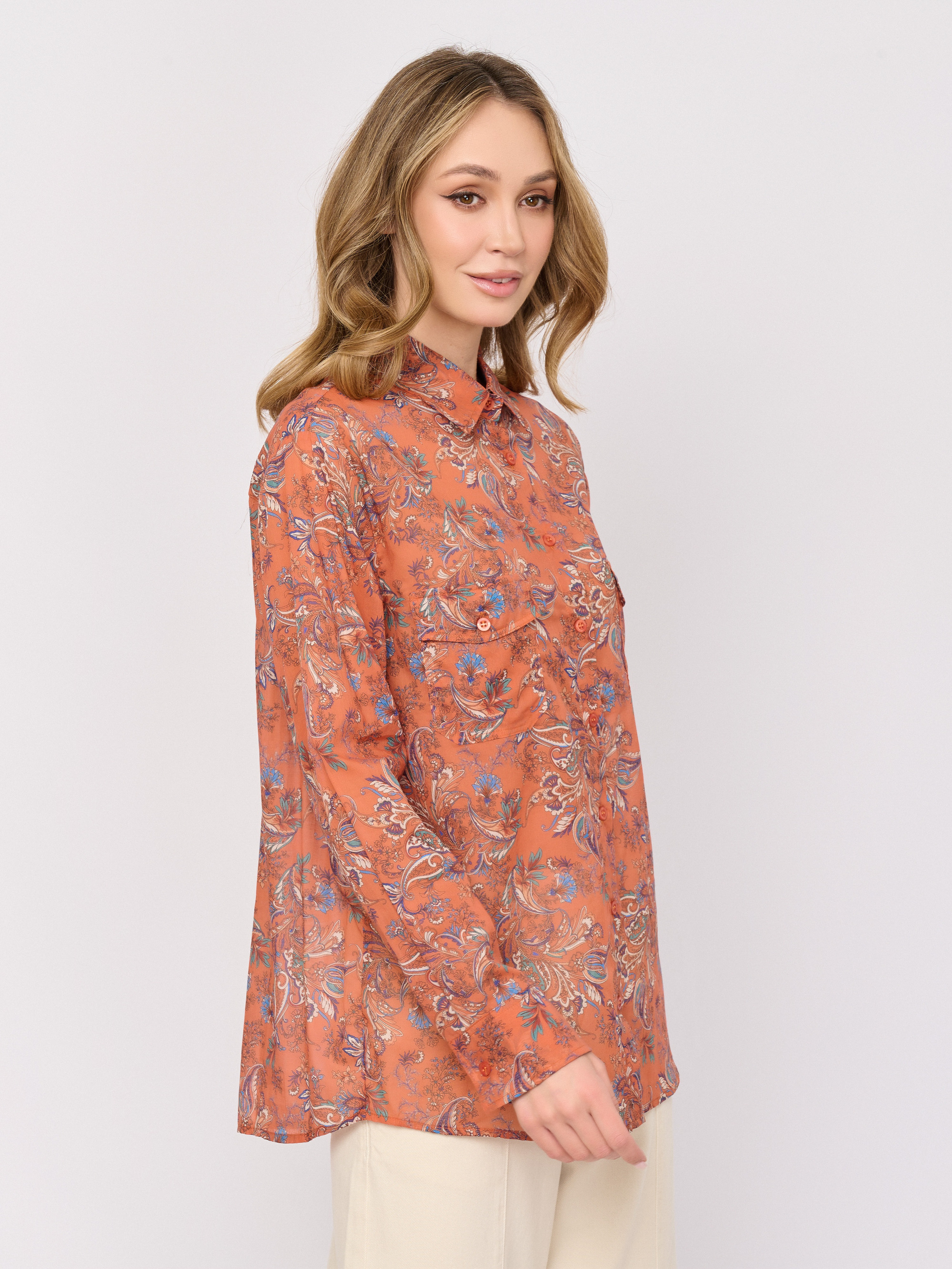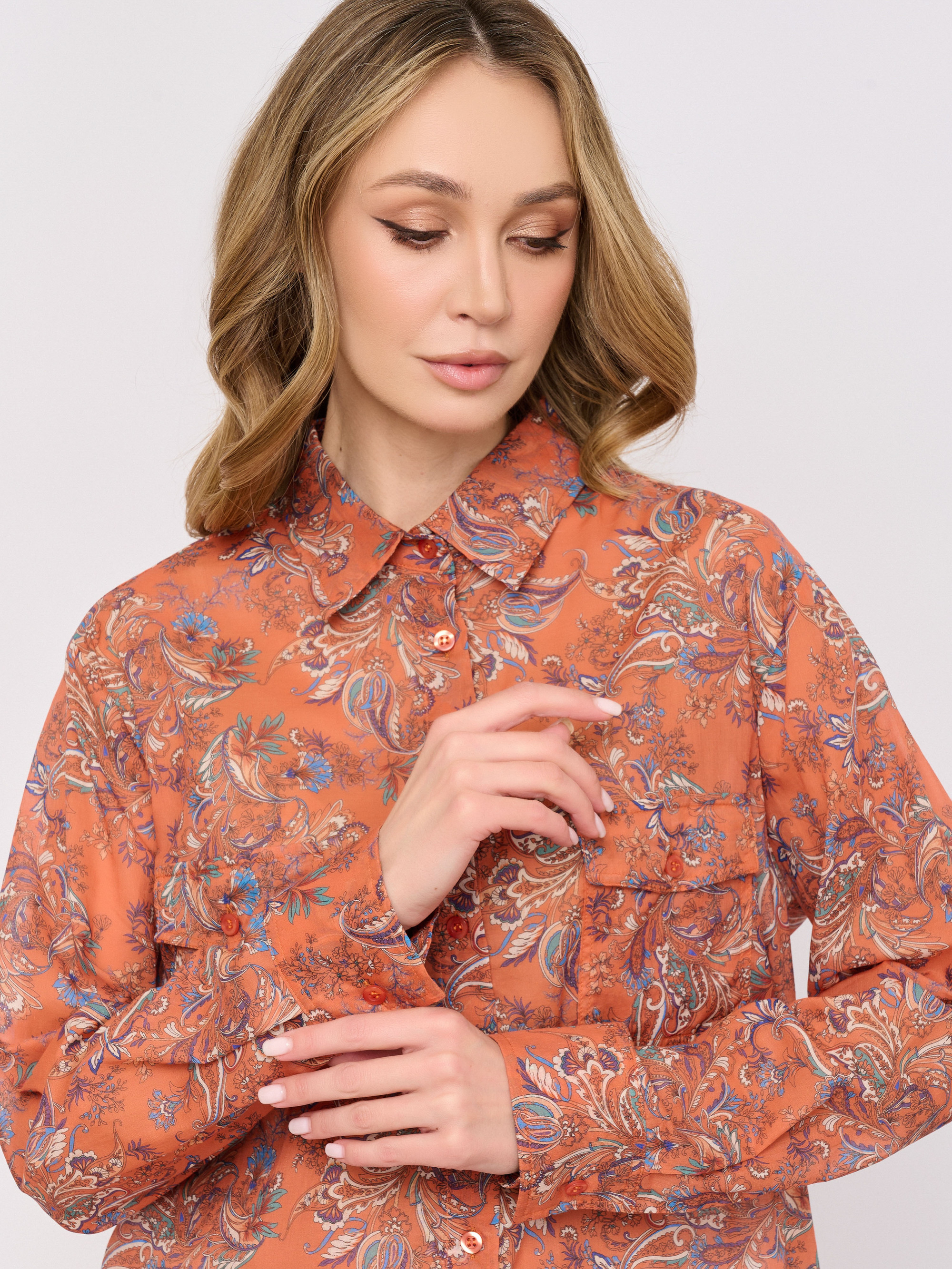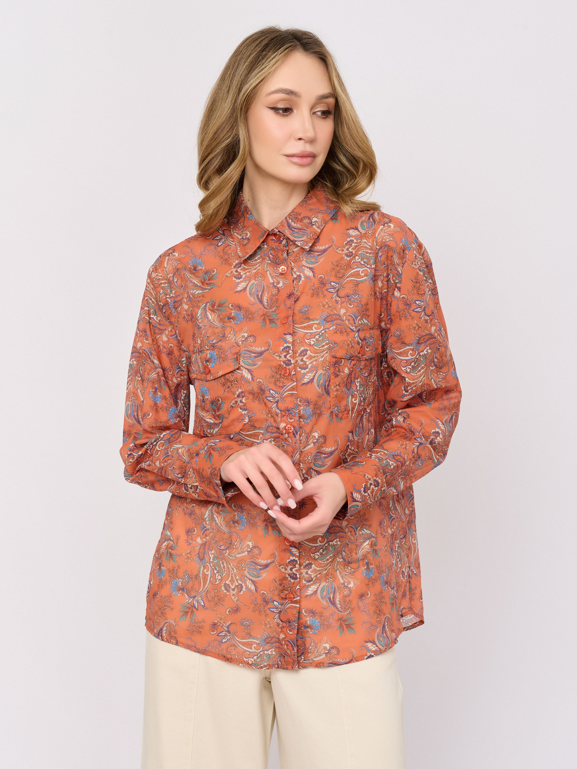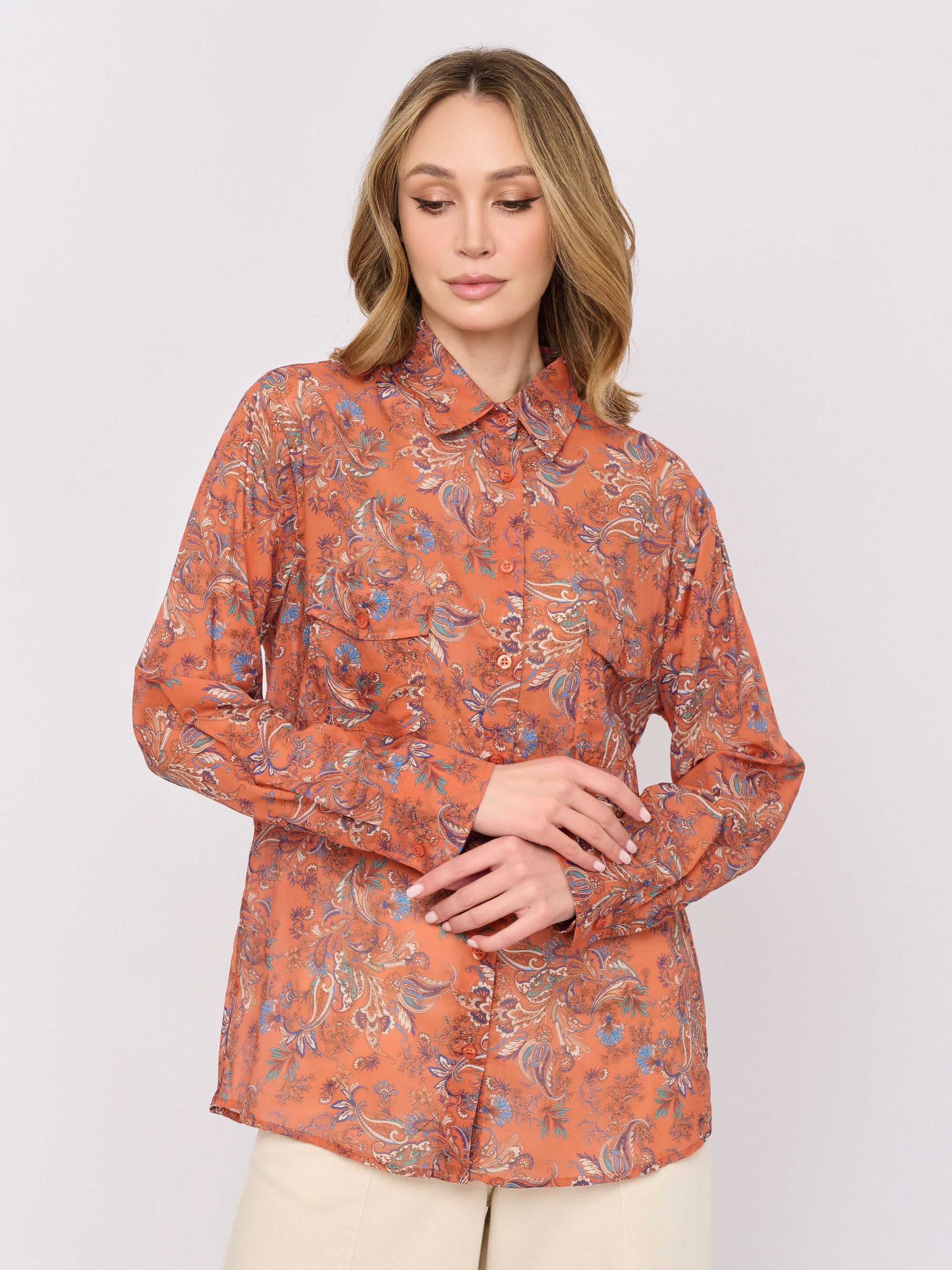 Детали: застежка пуговицы, рукава длинные, покрой прямой, рисунок пэйсли, карманы накладные.