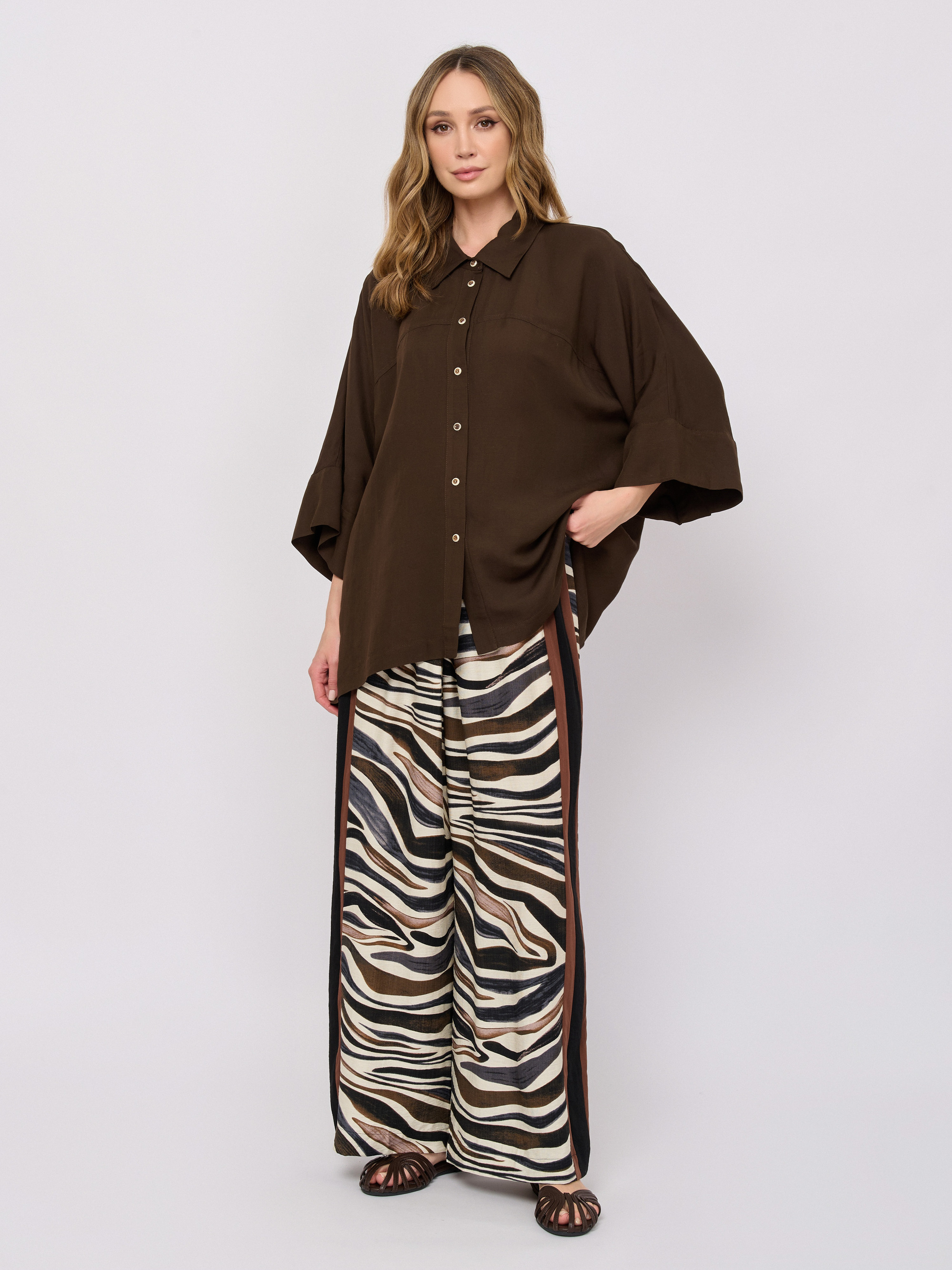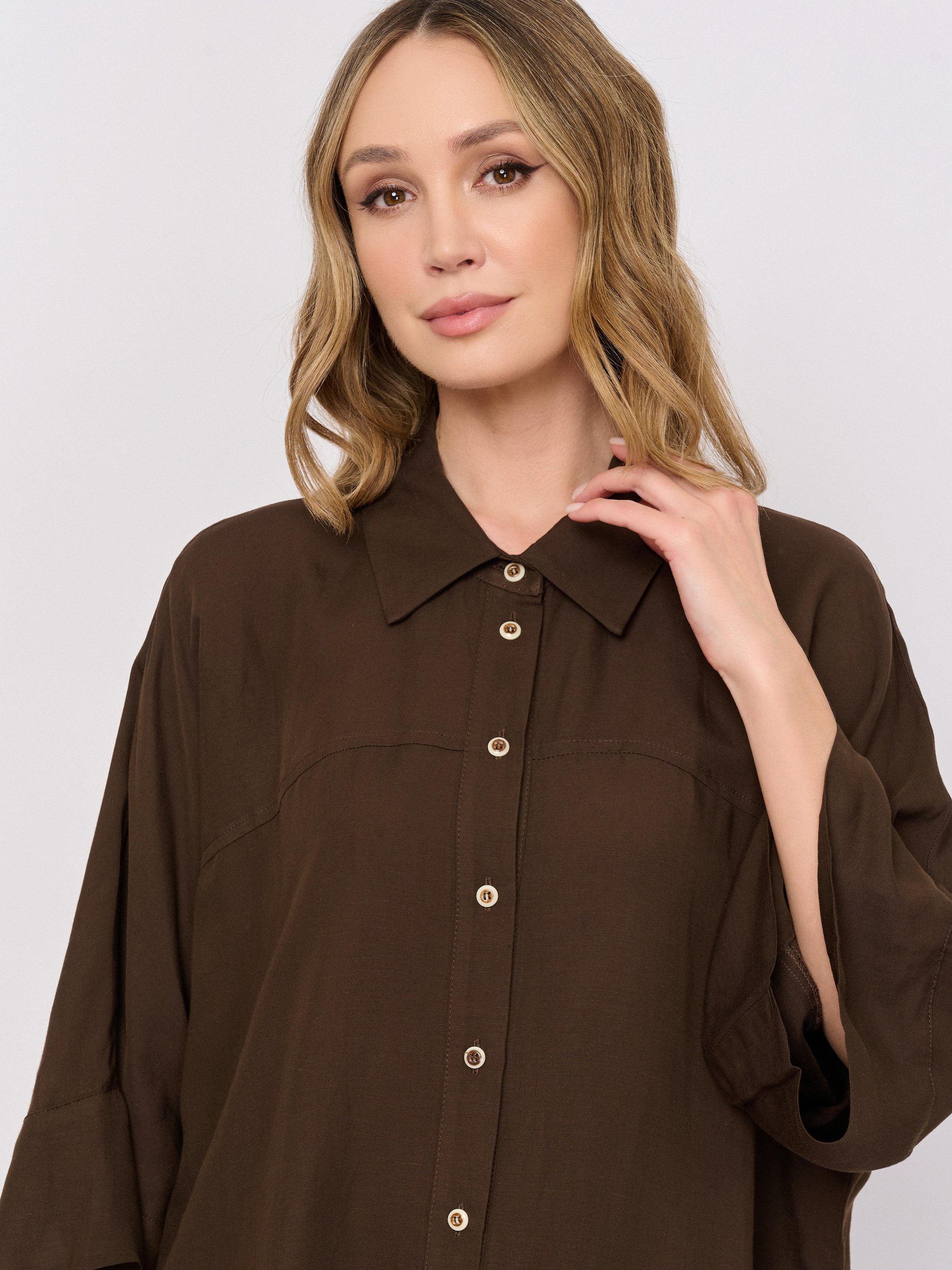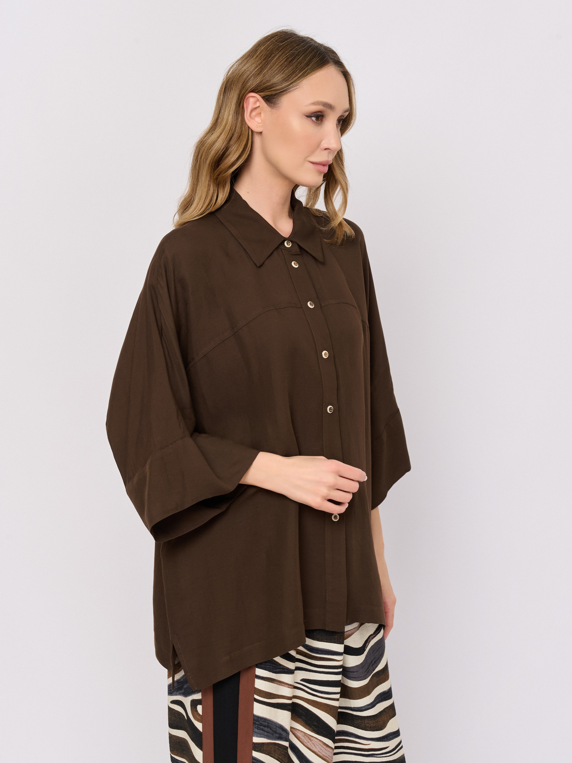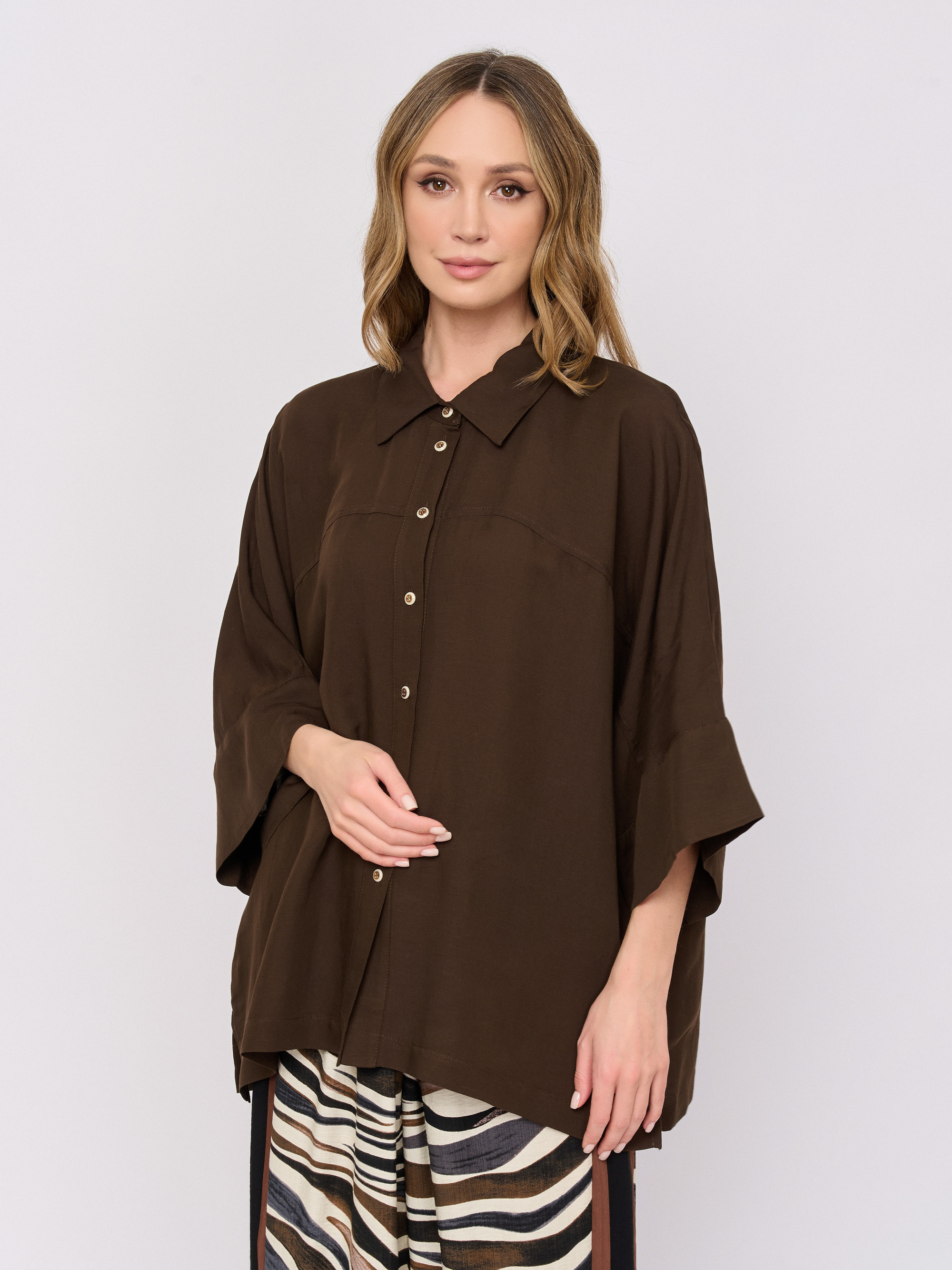Детали: застежка пуговицы, рукава средние, покрой прямой, рисунок однотонный, без карманов.