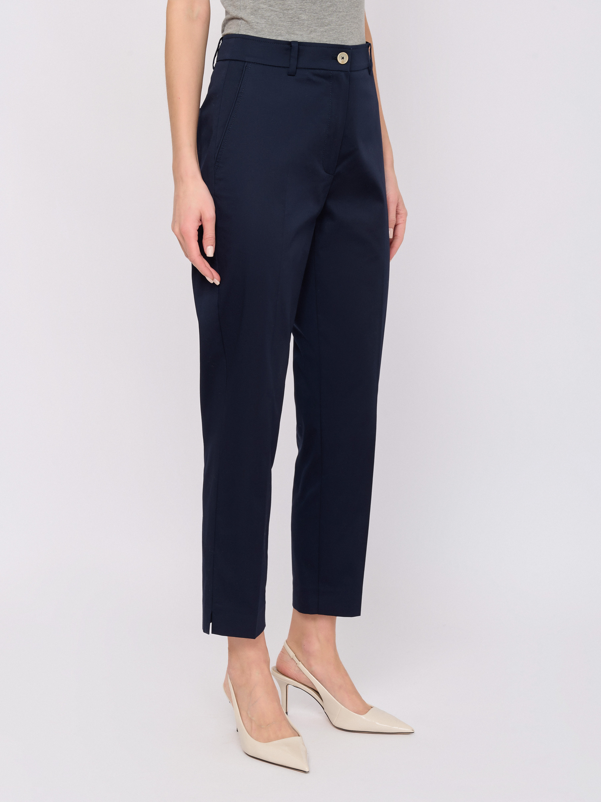 Детали: застежка молния, рисунок однотонный, карманы косые, крой брючин зауженный, посадка низкая.