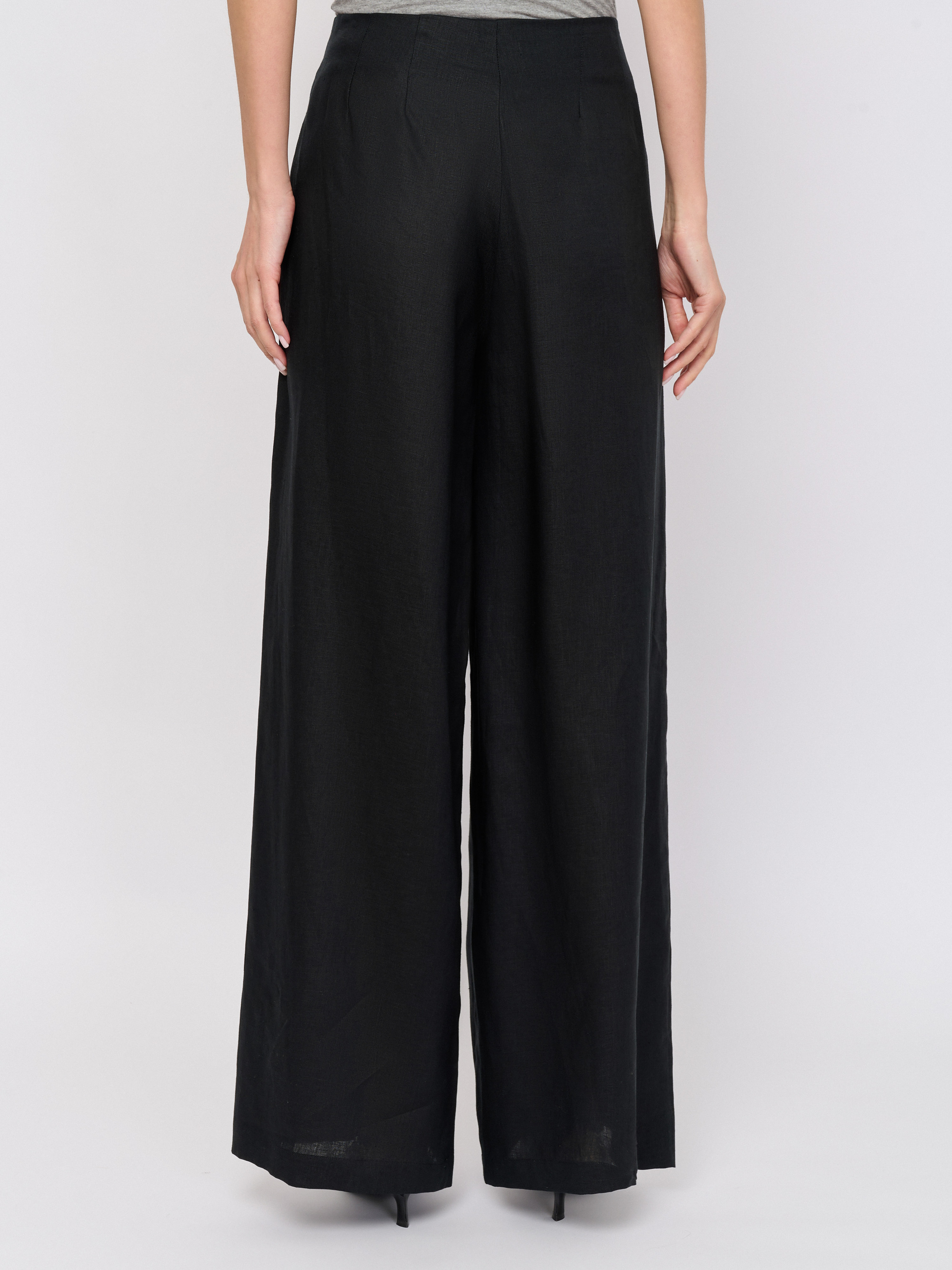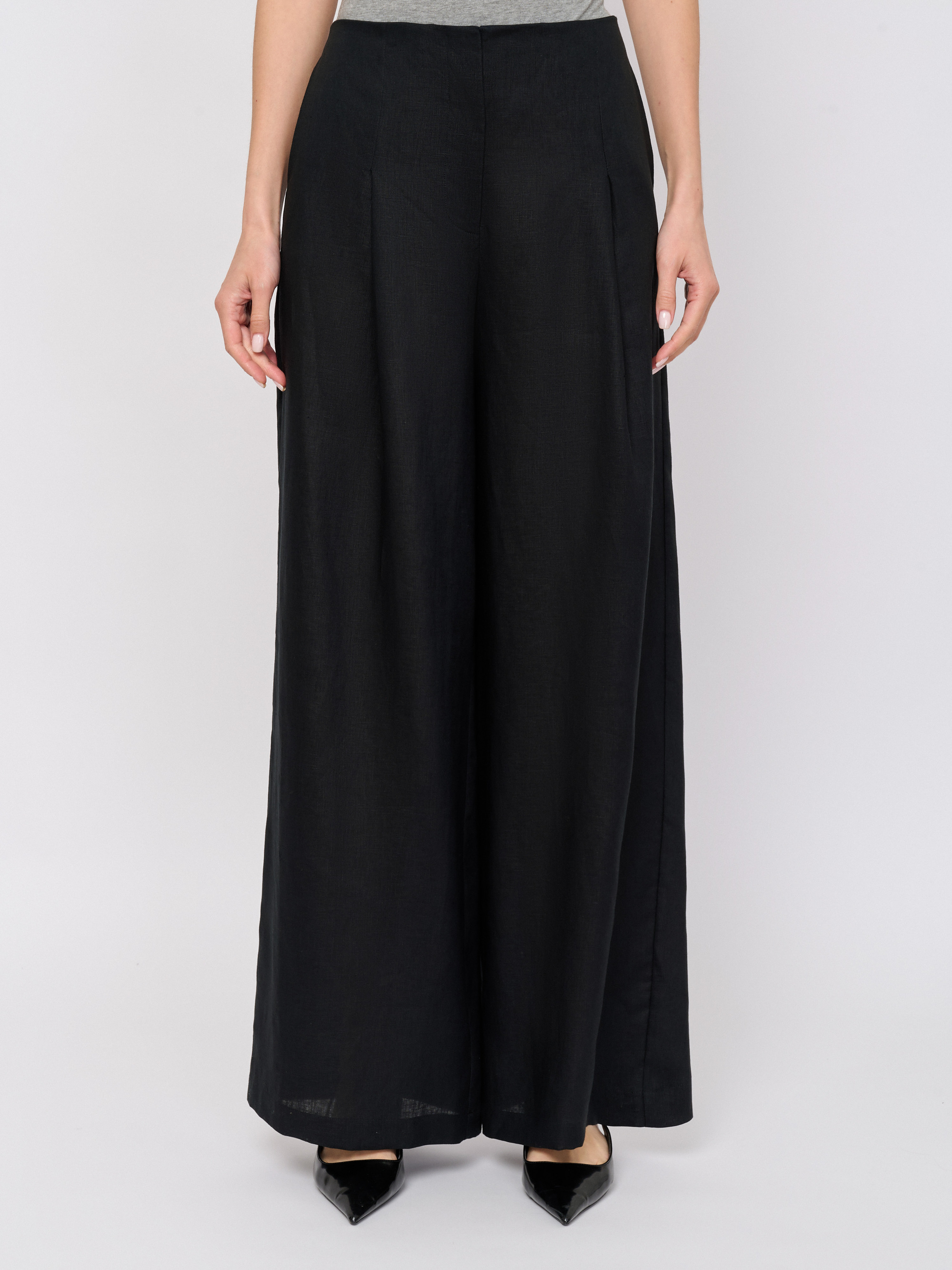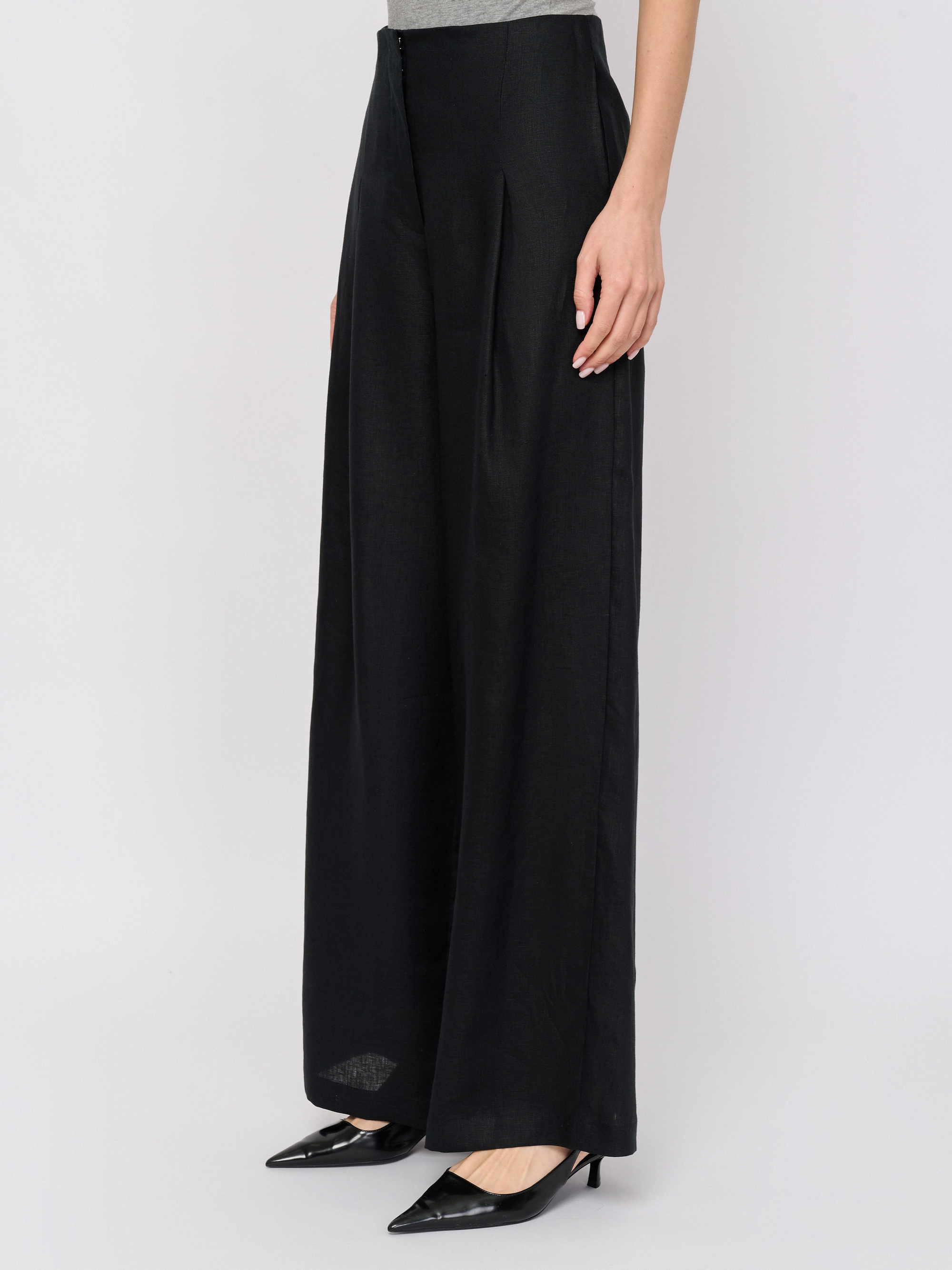 Детали: застежка молния, рисунок однотонный, карманы в шве, крой брючин широкий, посадка высокая.