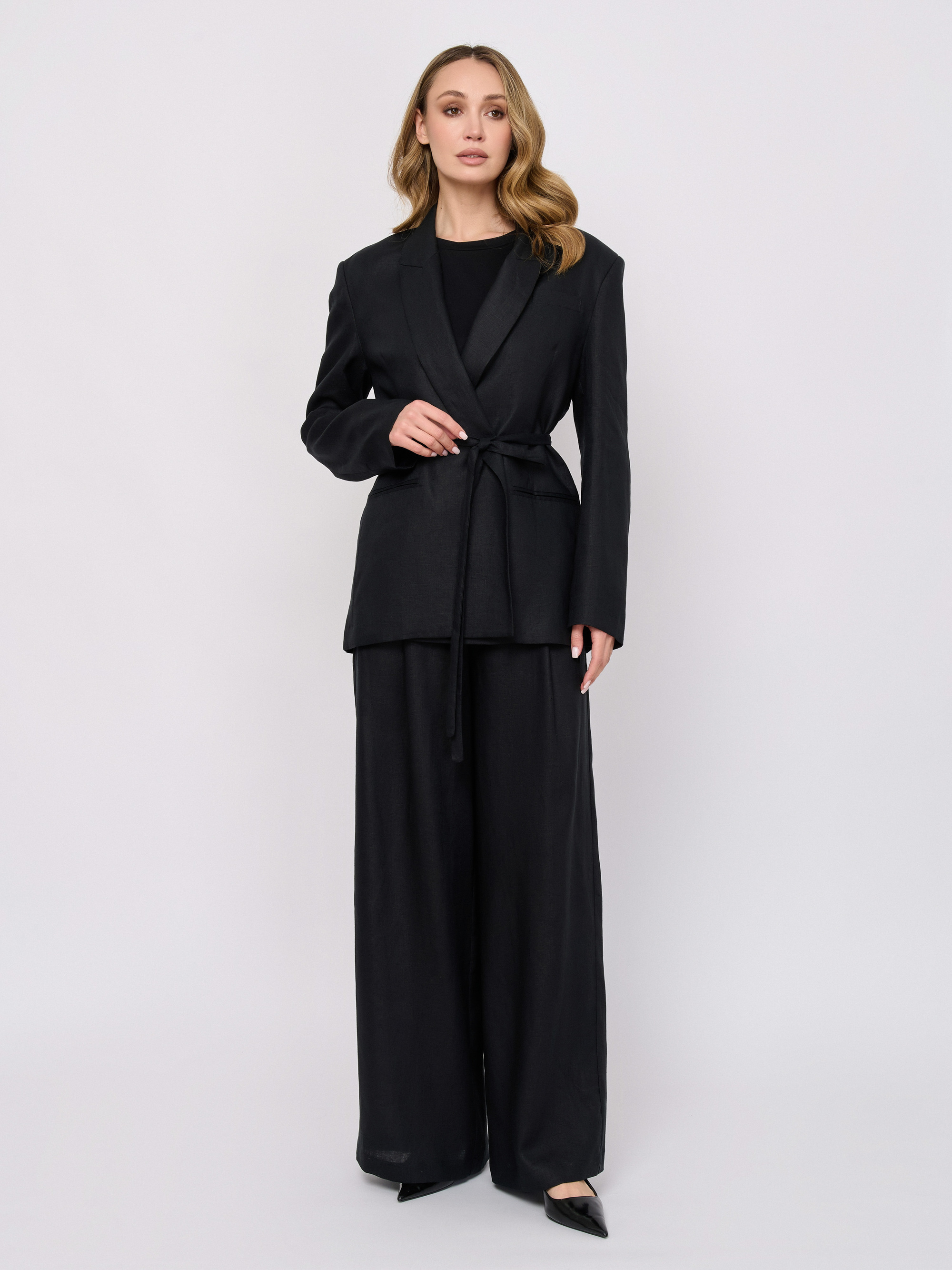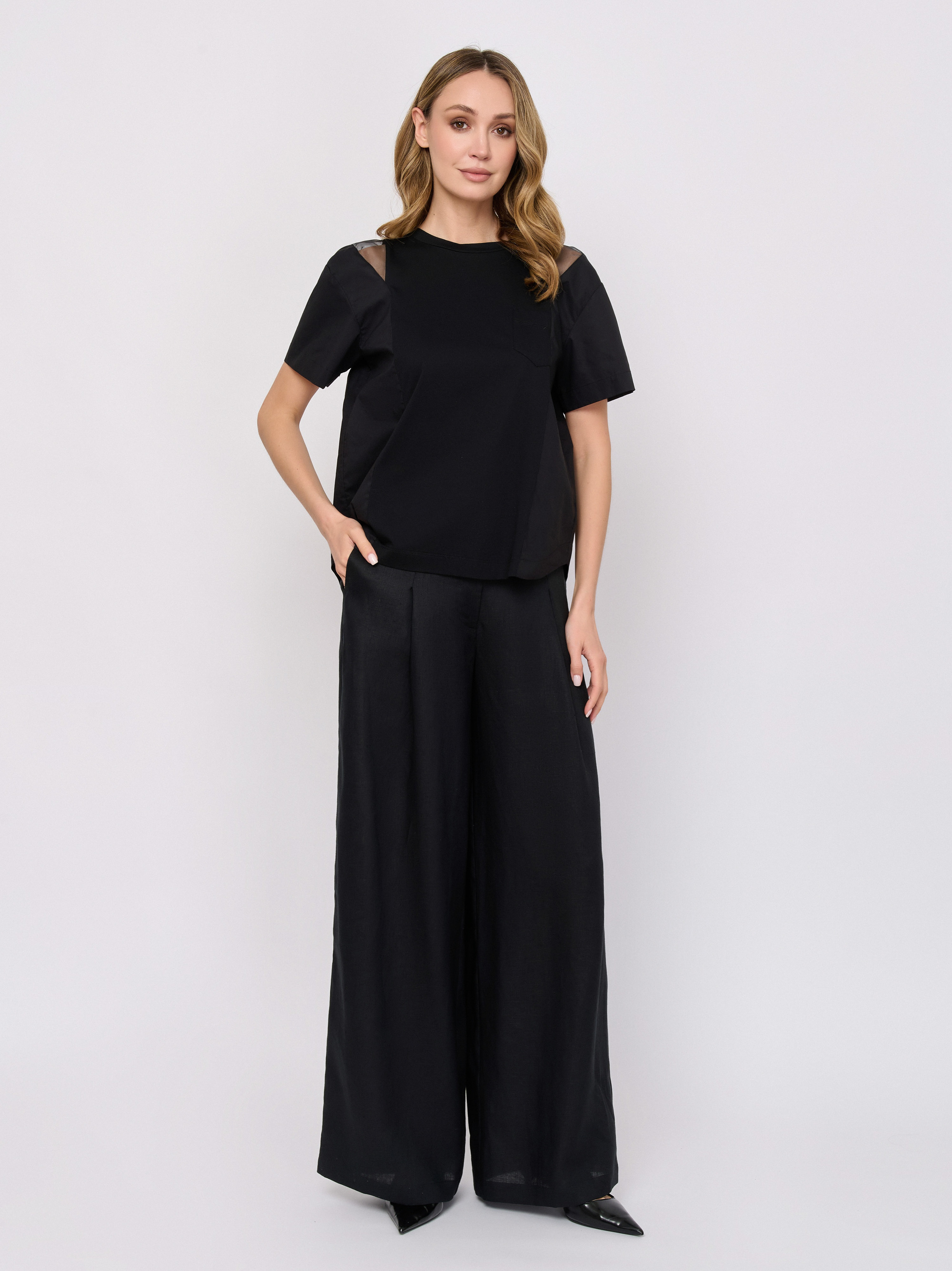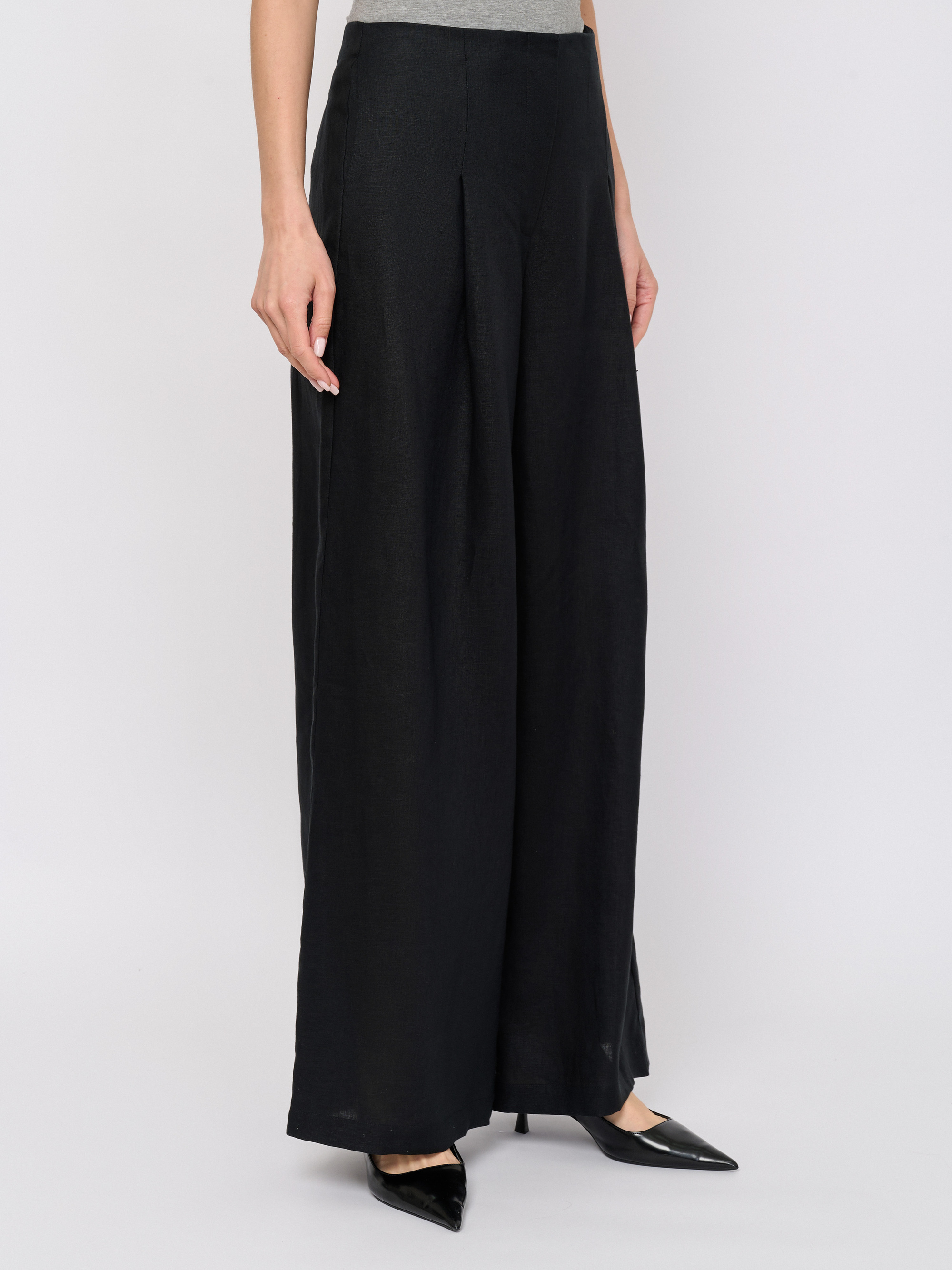 Детали: застежка молния, рисунок однотонный, карманы в шве, крой брючин широкий, посадка высокая.