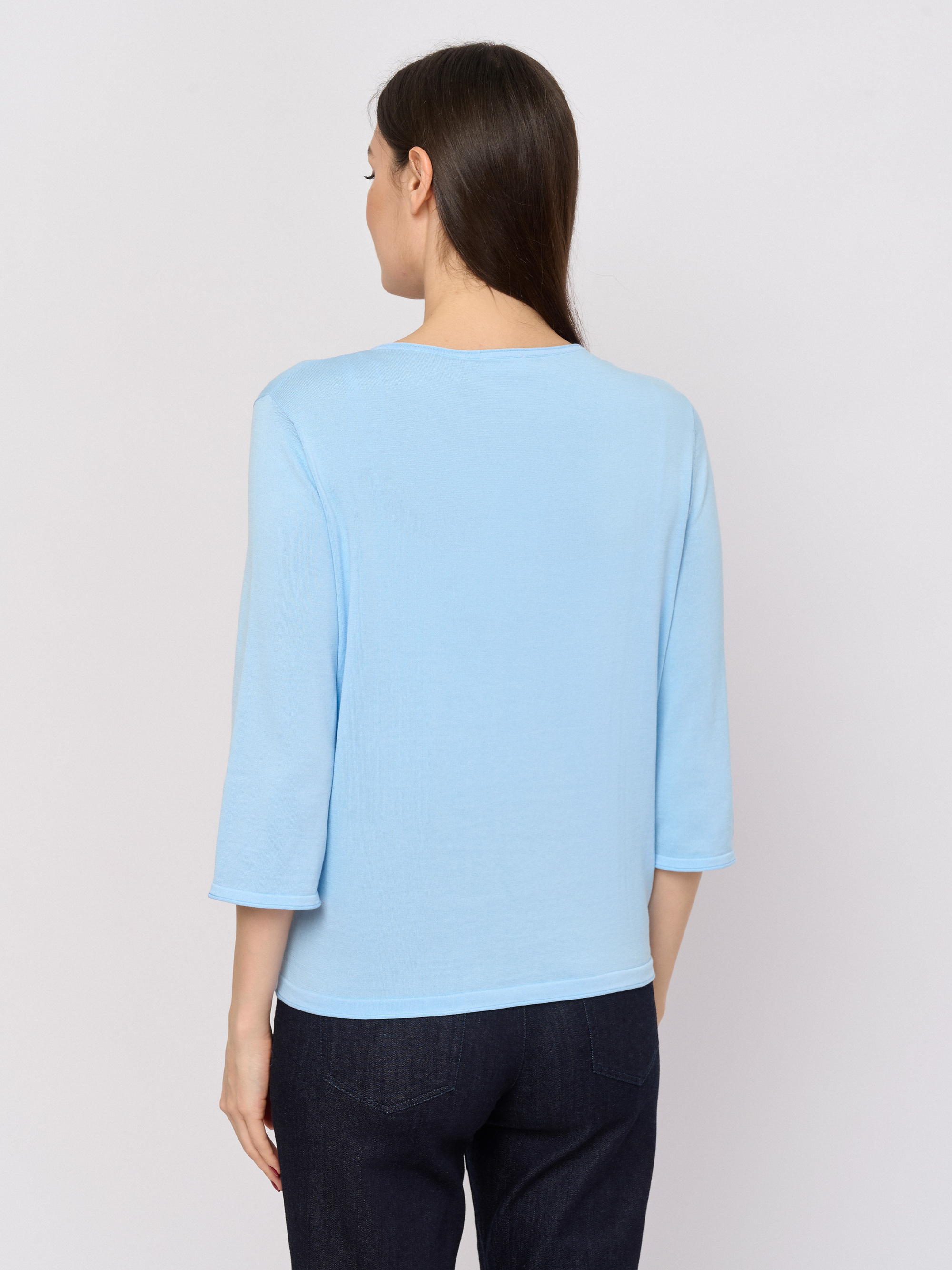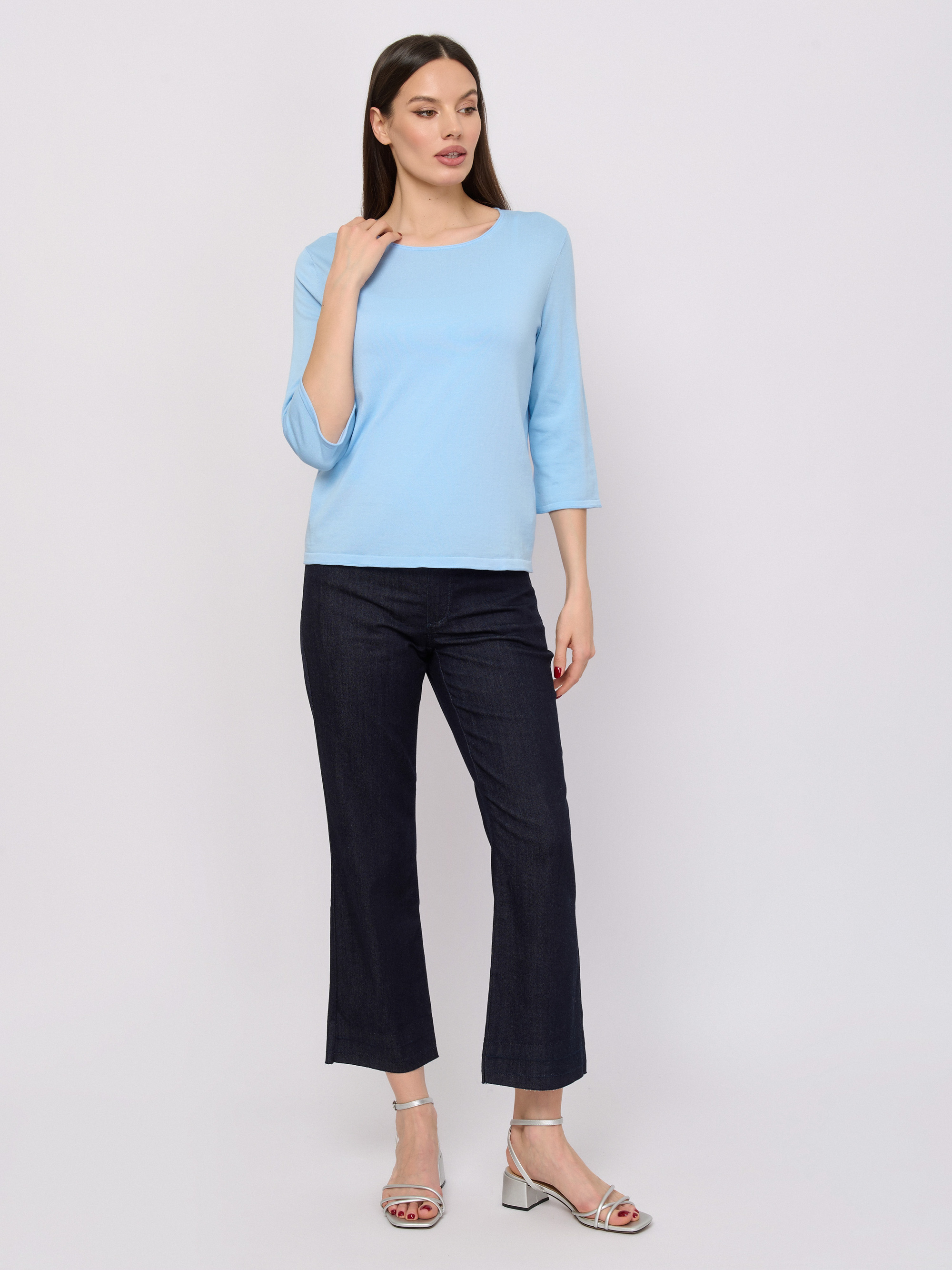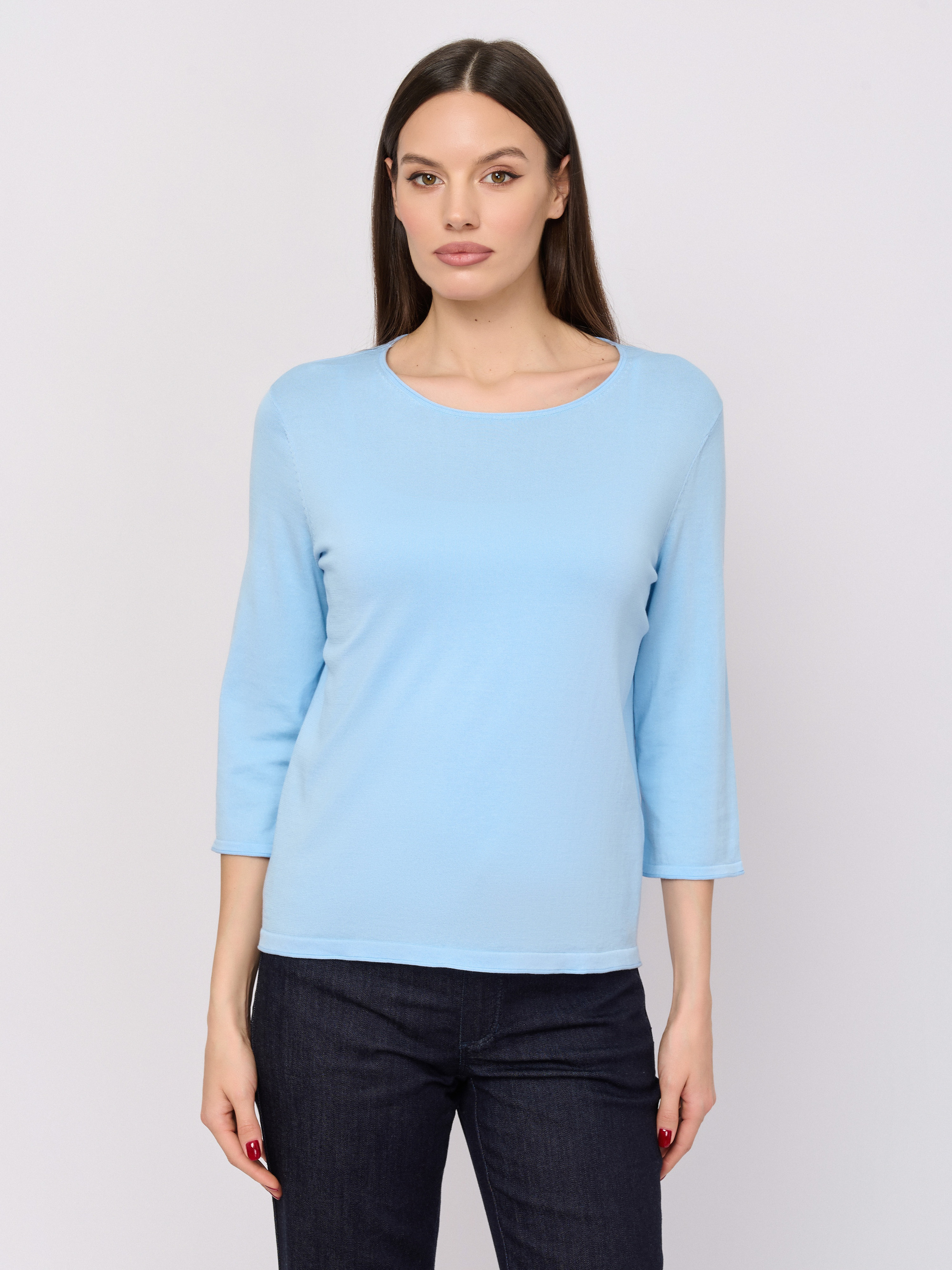 Детали: вырез горловины округлый, рукава три четверти, покрой прямой, рисунок однотонный.