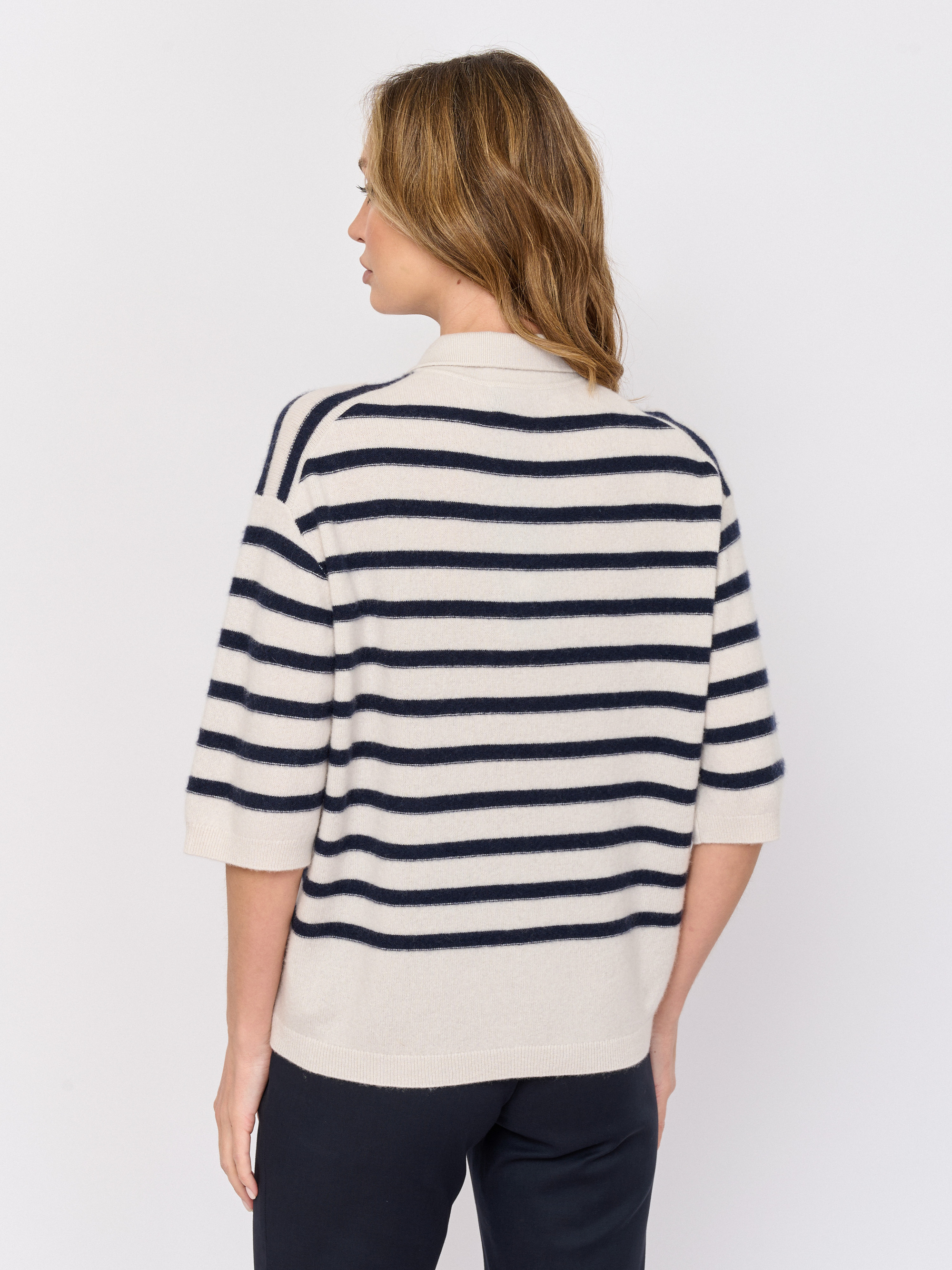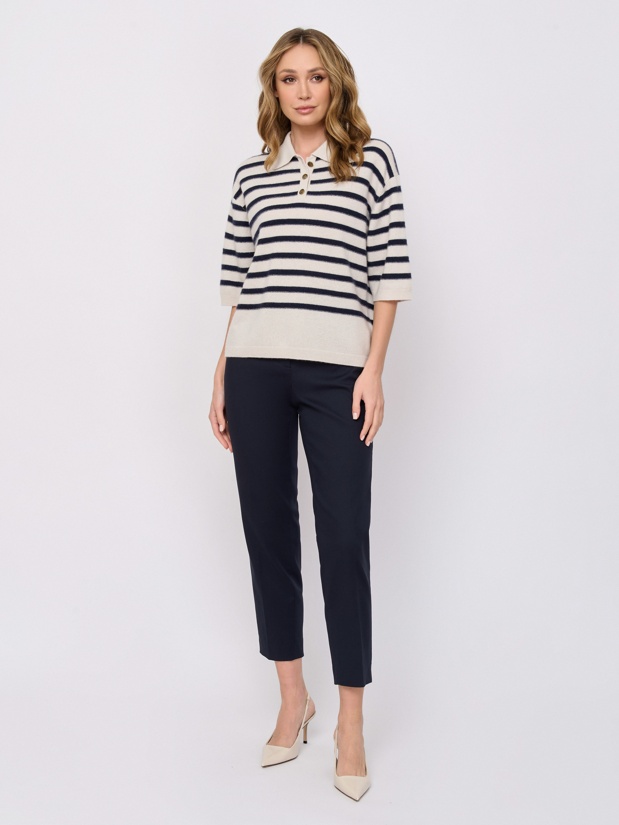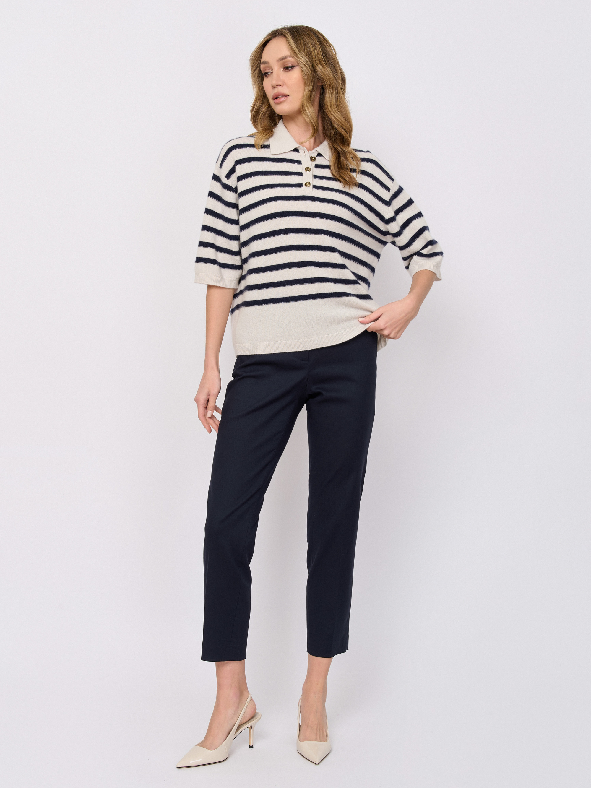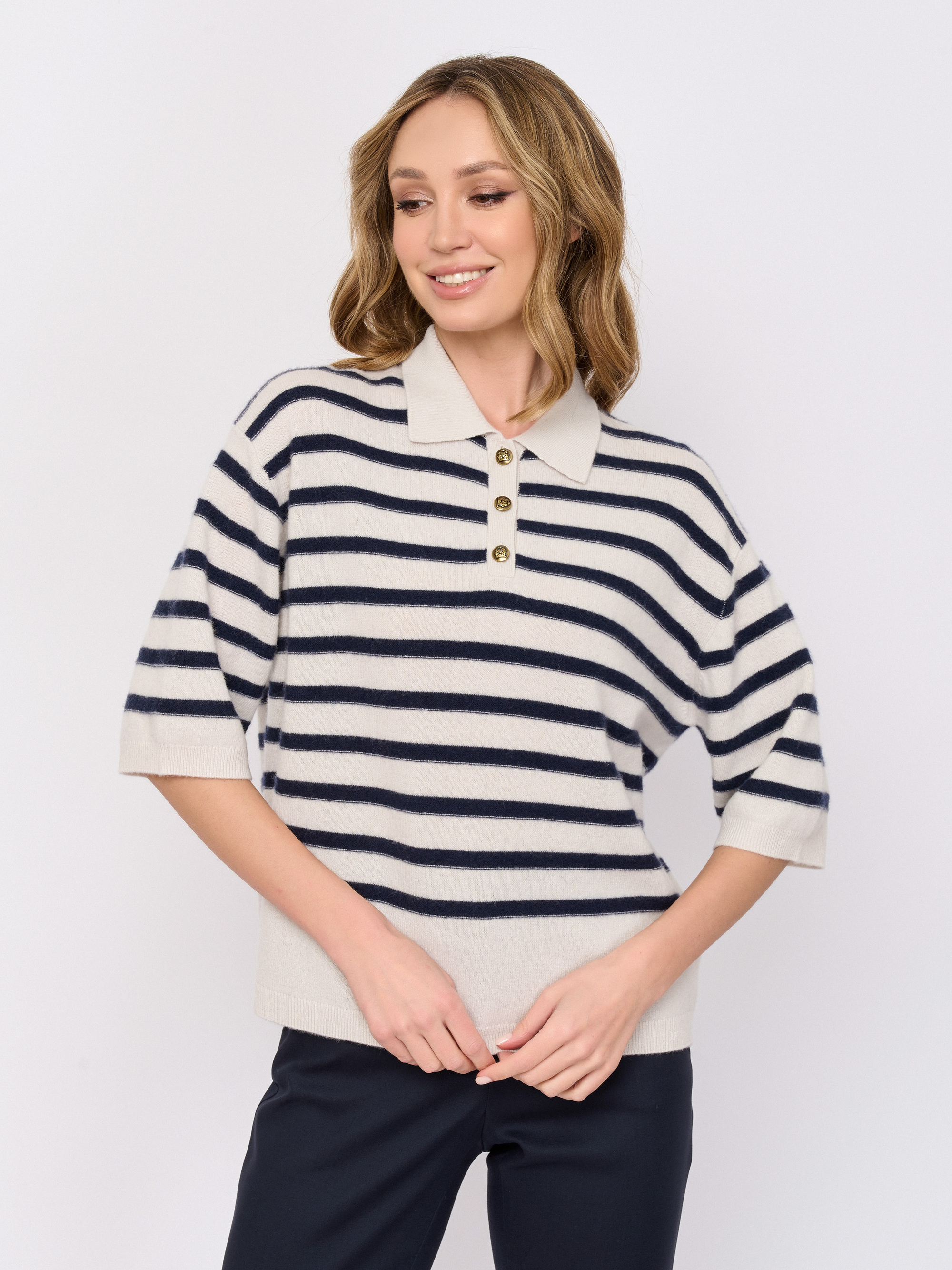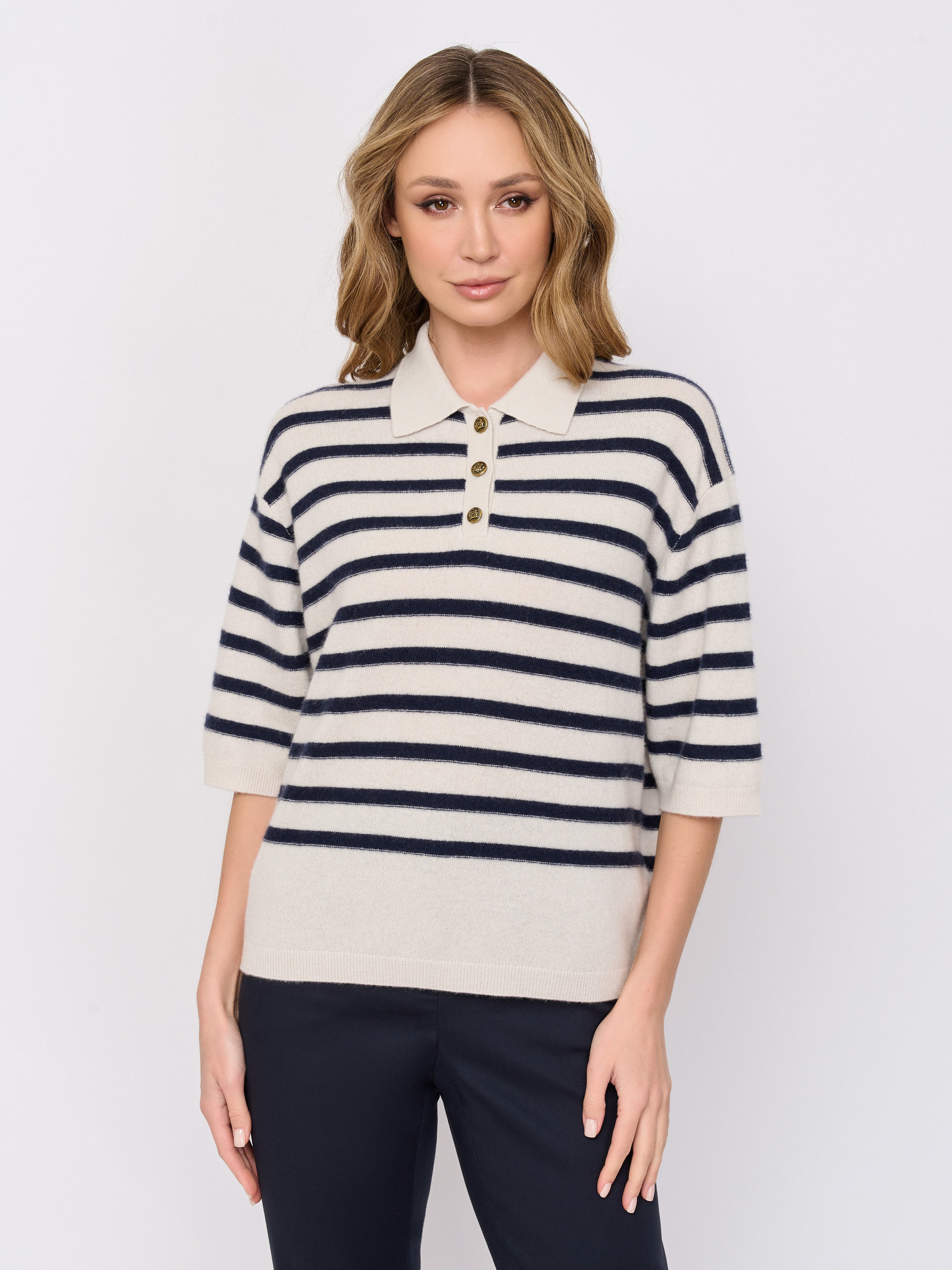 Детали: вырез горловины v-образный, рукава три четверти, покрой прямой, рисунок полоска.