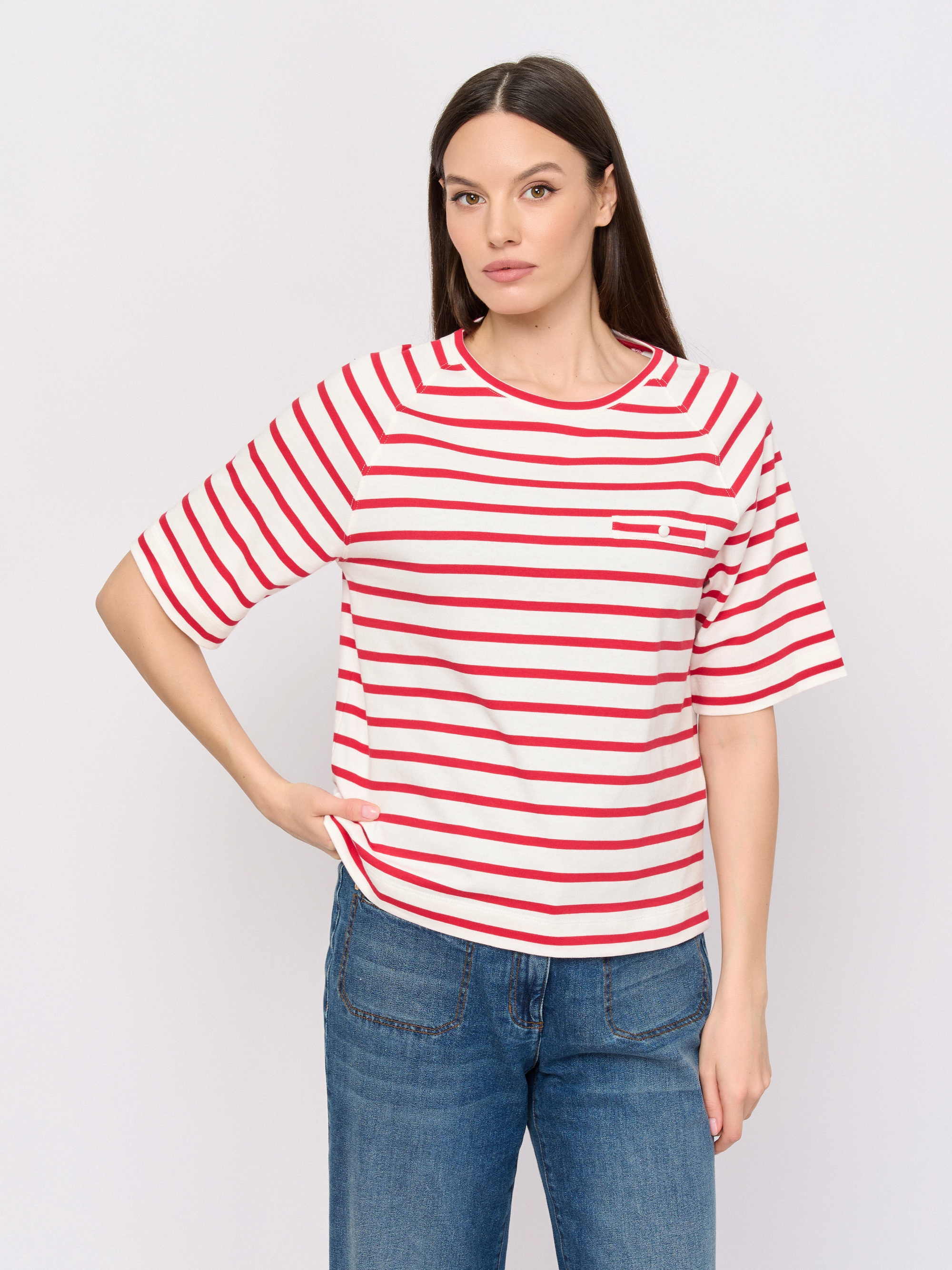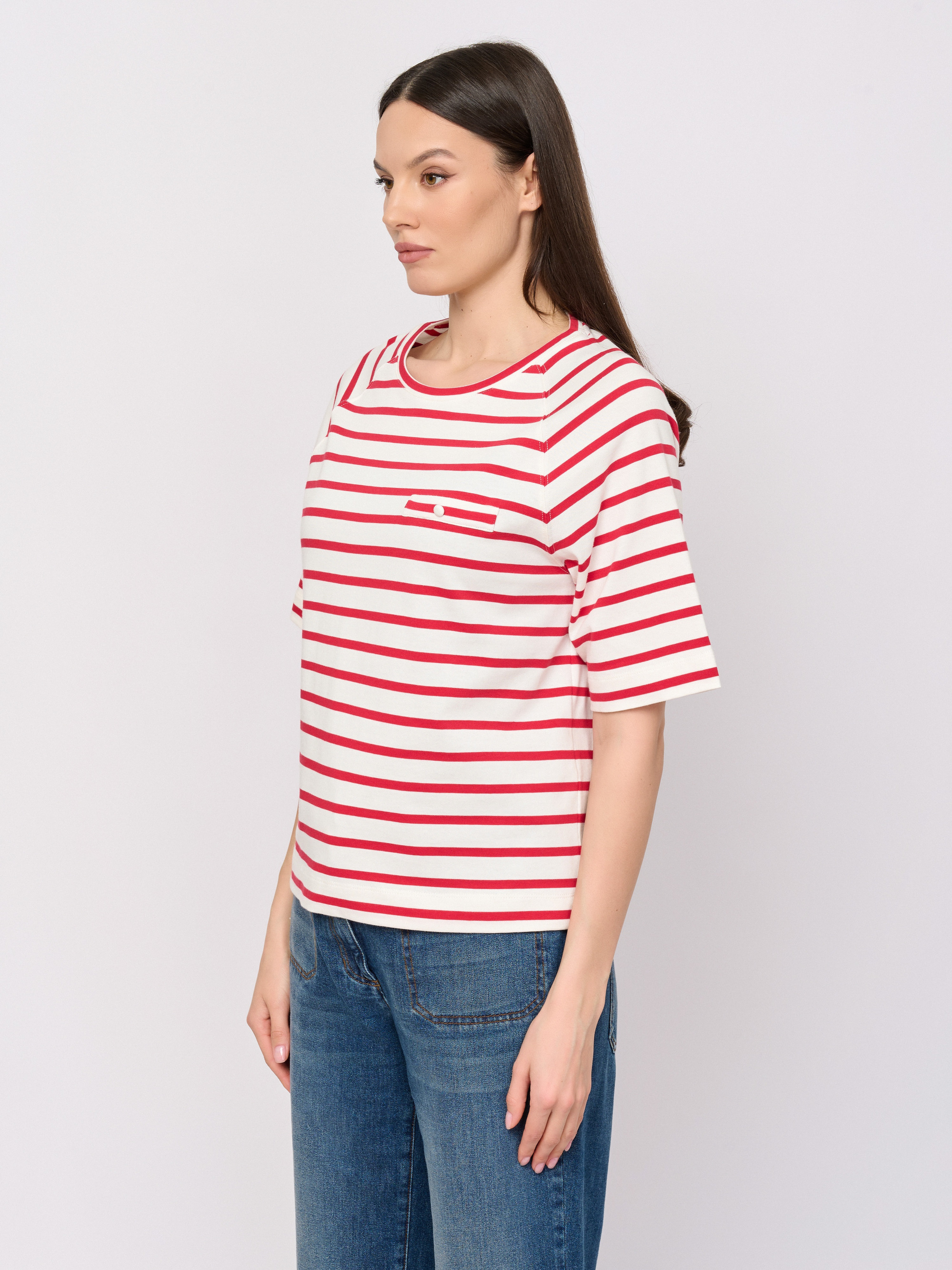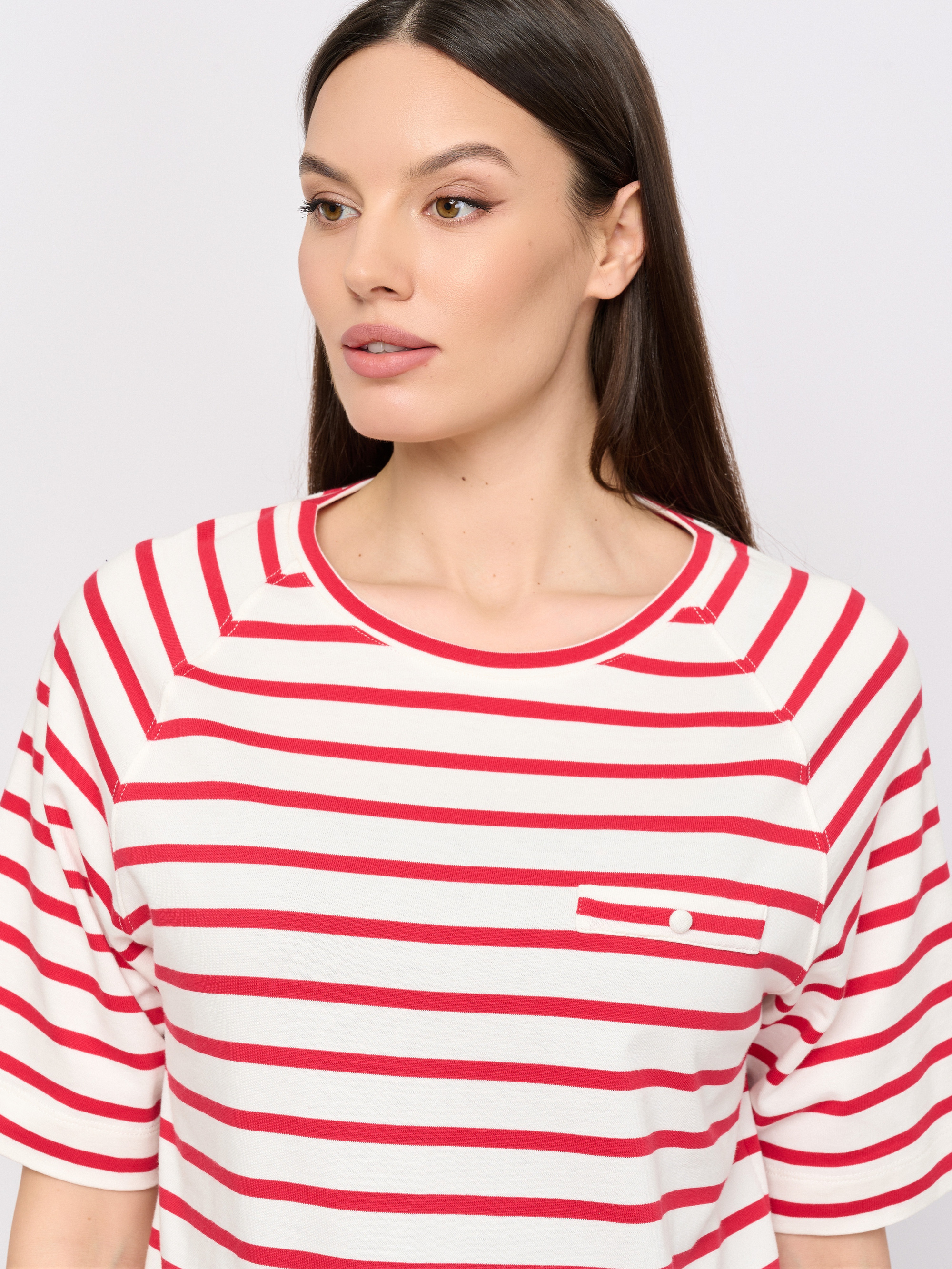 Детали: вырез горловины округлый, покрой прямой, рисунок полоска, без надписи.