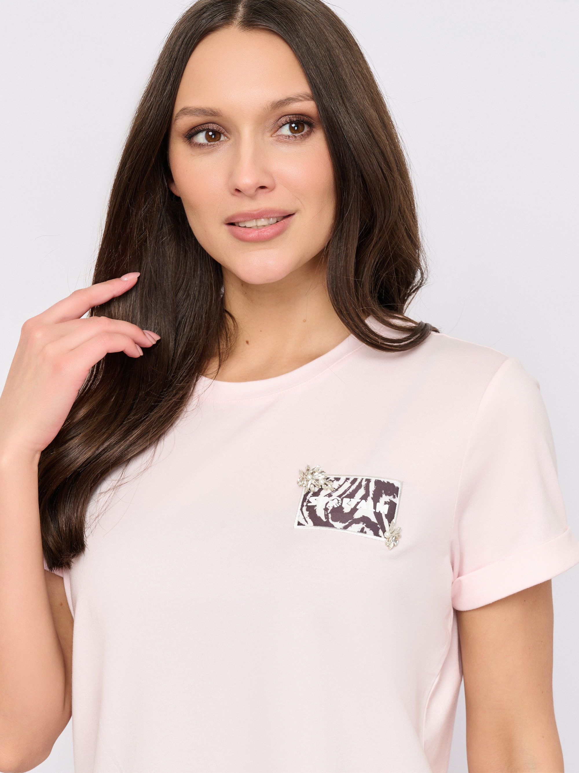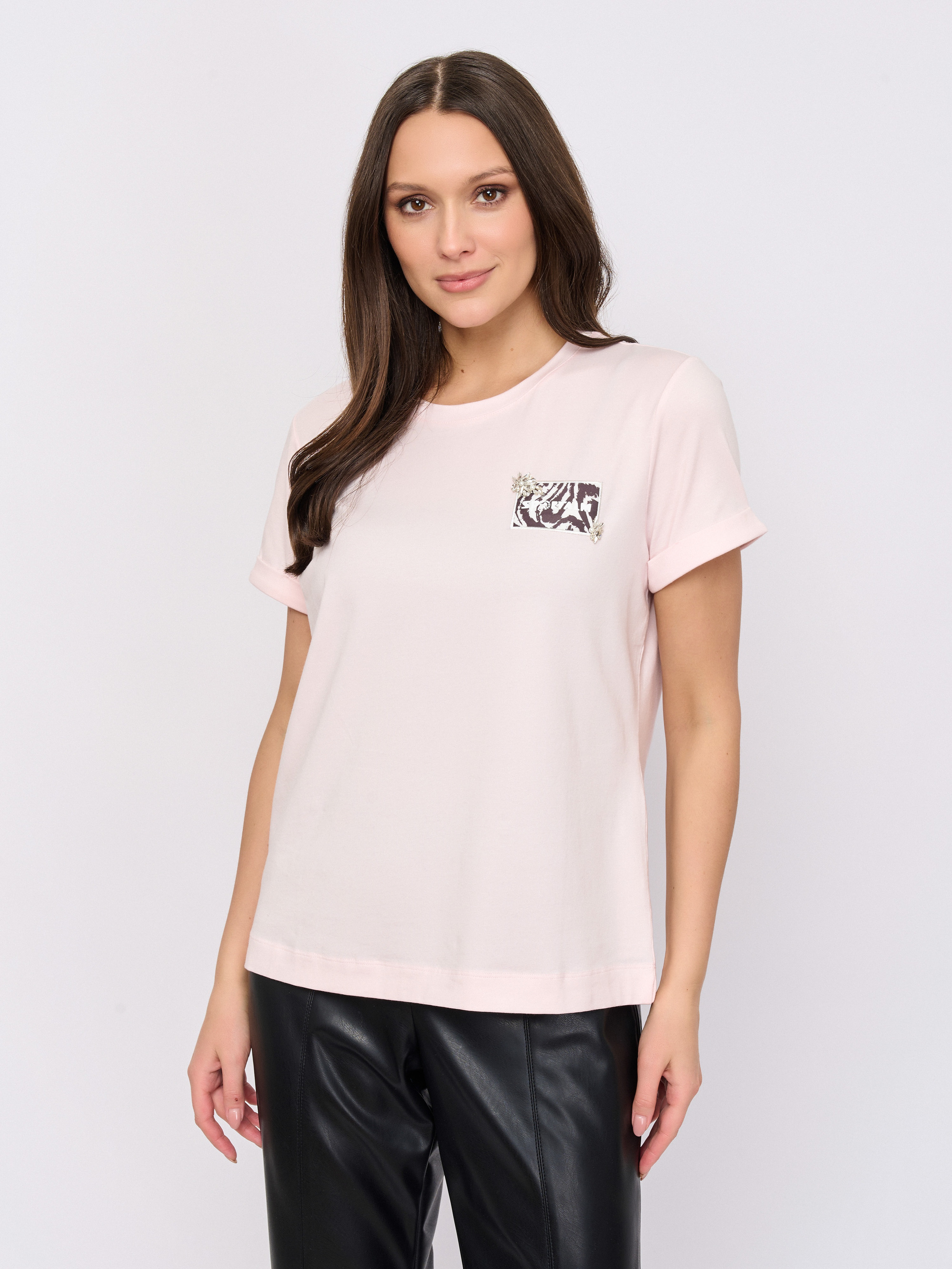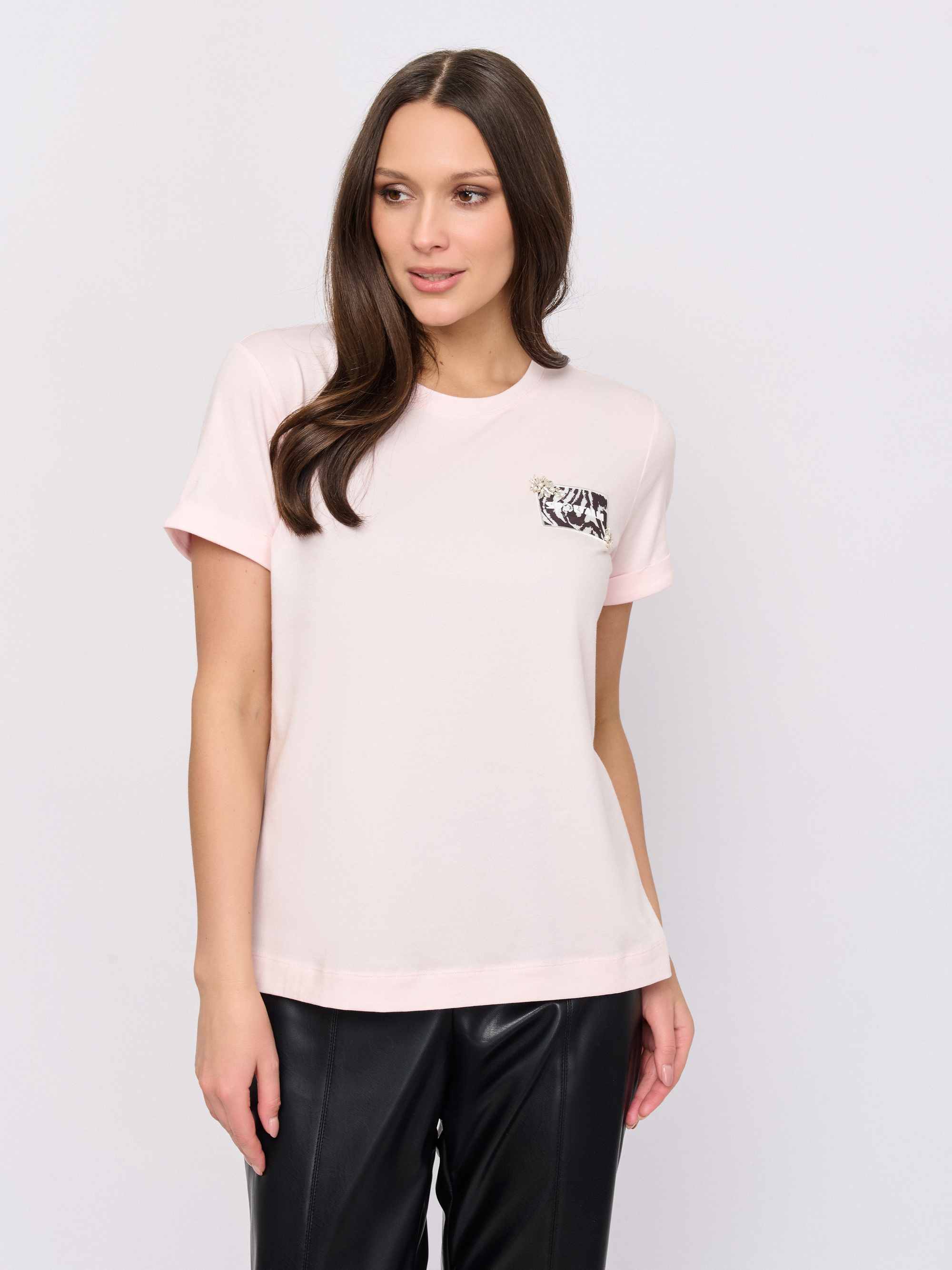 Детали: вырез горловины округлый, покрой прямой, рисунок однотонный, наличие надписи с надписью, стразы.