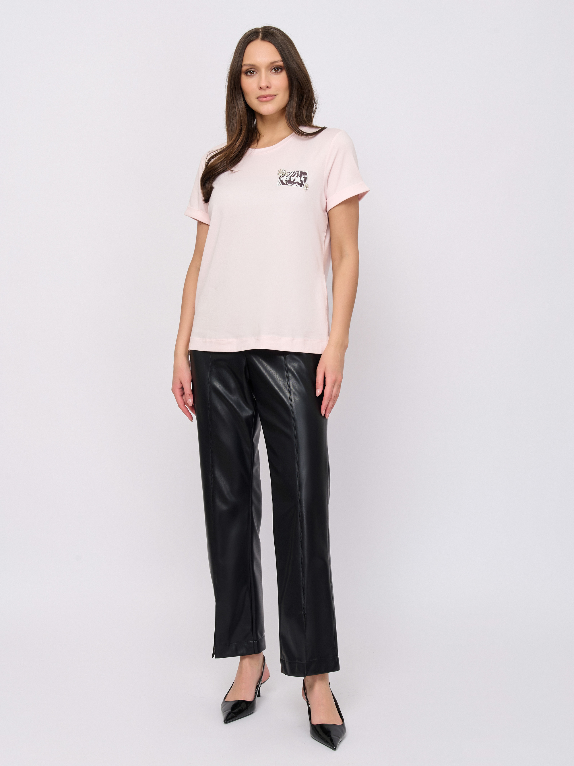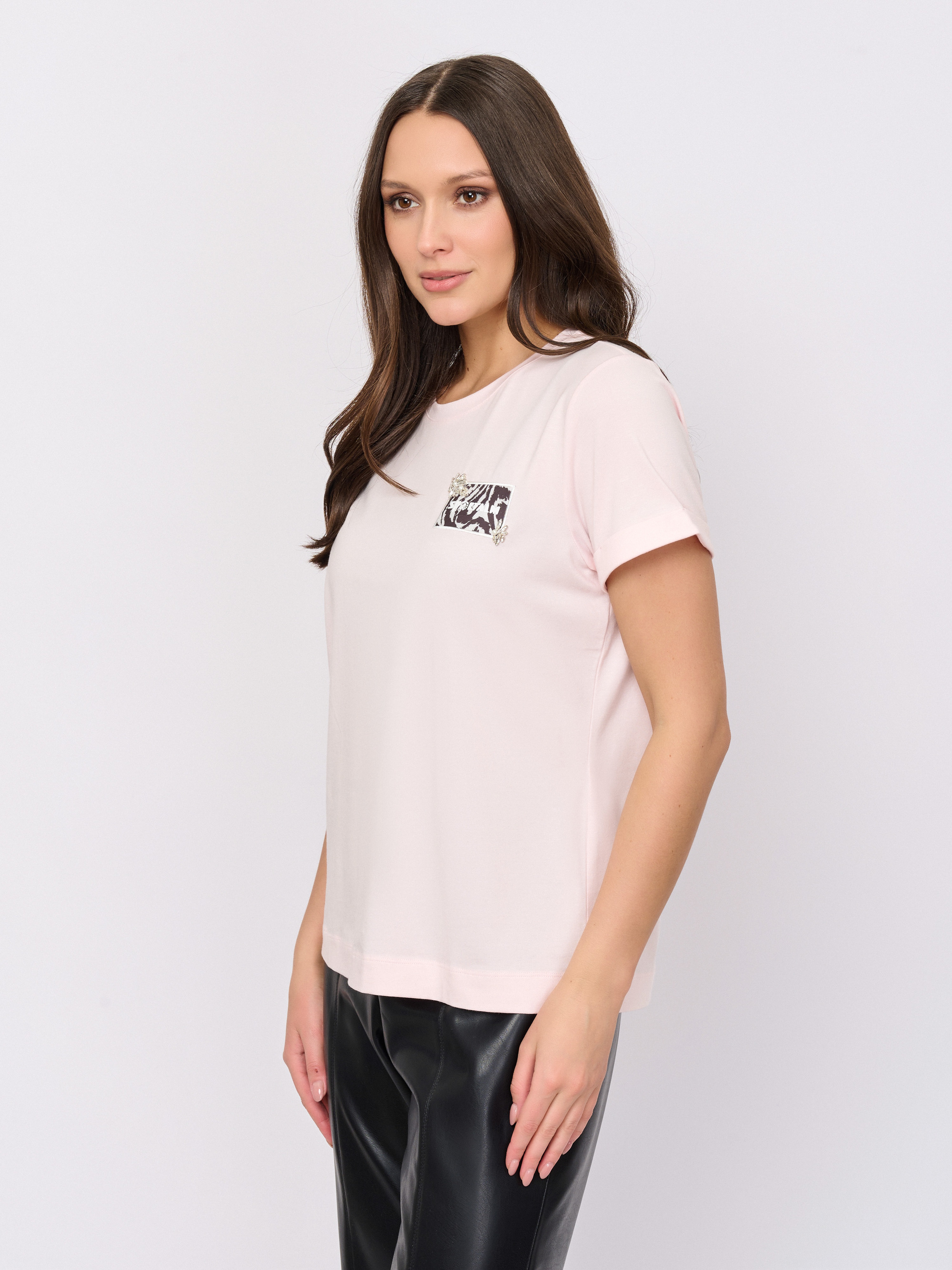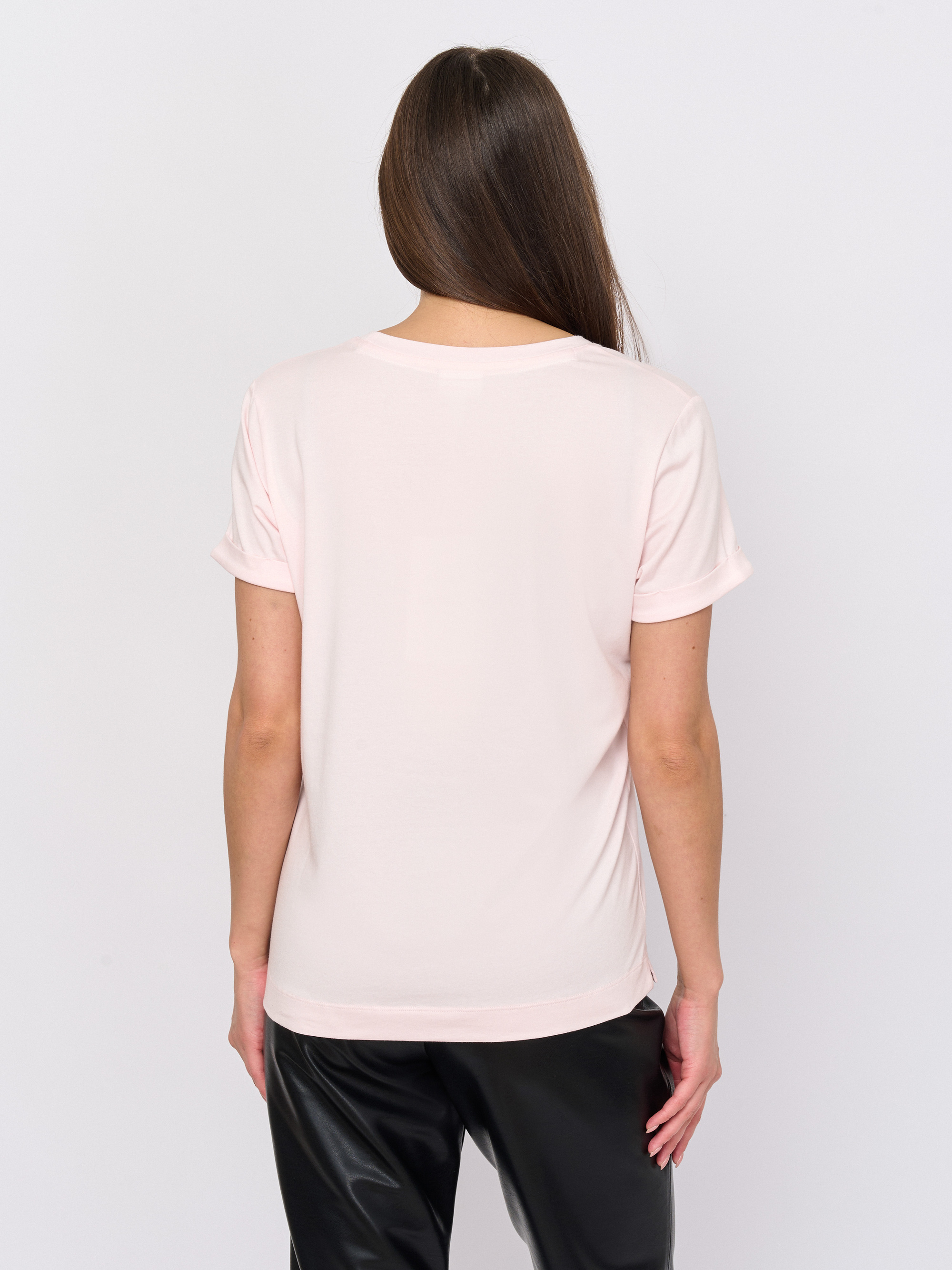 Детали: вырез горловины округлый, покрой прямой, рисунок однотонный, наличие надписи с надписью, стразы.